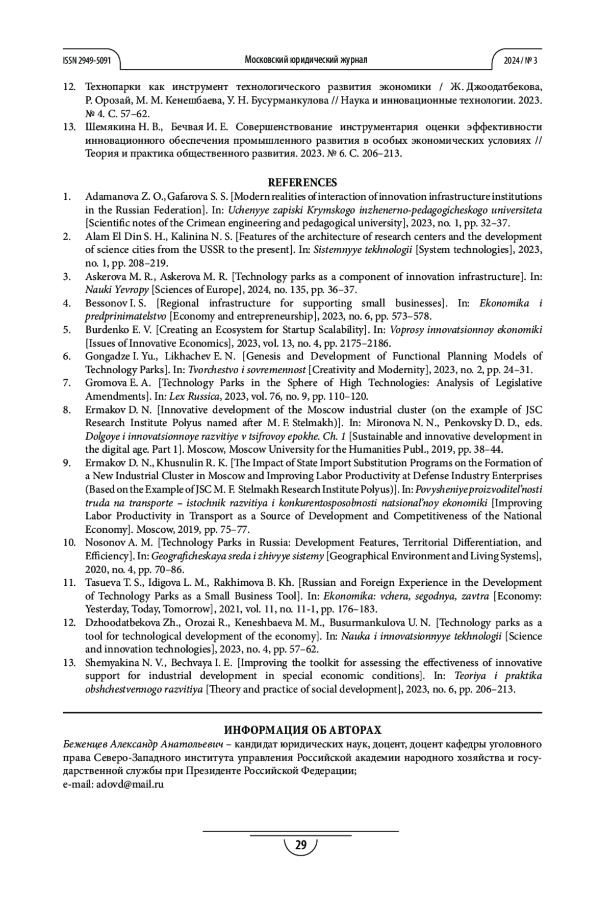 10. Носонов А. М. Технопарки России: особенности развития, территориальная дифференциация и эффективность // Географическая среда и живые системы. 2020. № 4. С. 70-86.