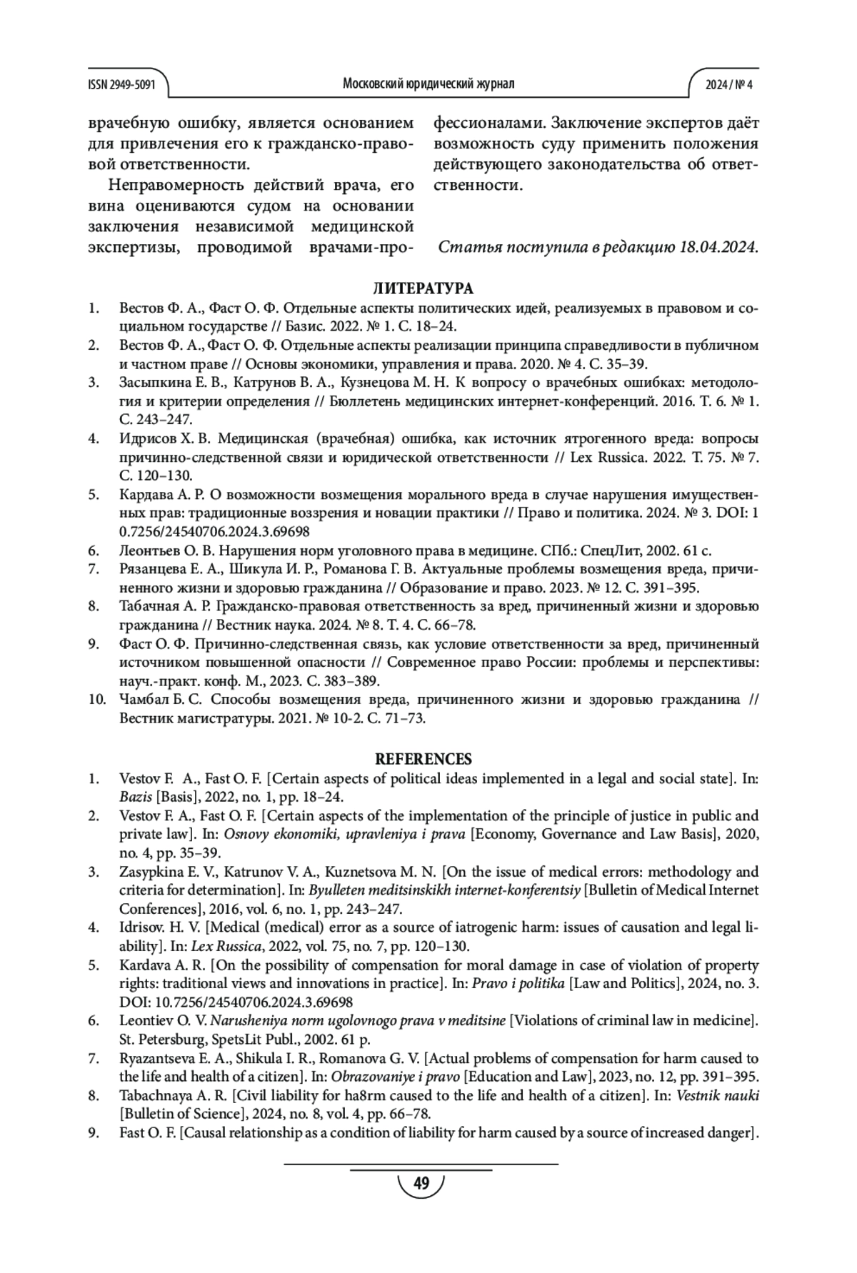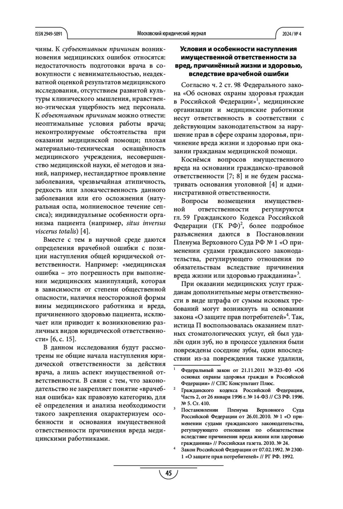 Результаты. Анализ особенностей наступления ответственности и обобщение судебной практики направлено на единообразное понимание правовых категорий, которые позволили бы суду не только возлагать ответственность на медицинских работников, но и давали бы ориентиры для освобождения их от имущественной ответственности и реализовывали принцип справедливого рассмотрения такой категории дела.