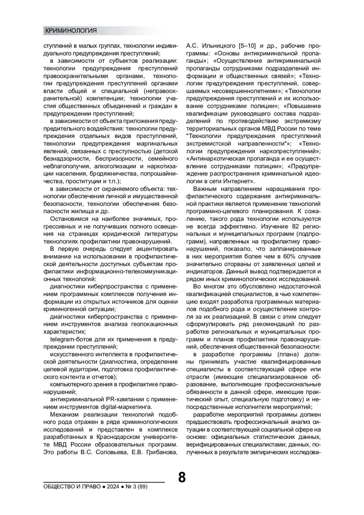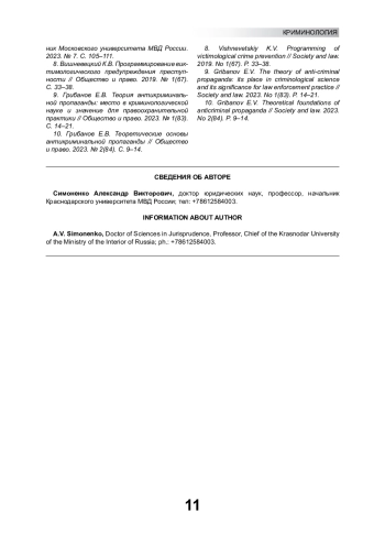 8. Вишневецкий К.В. Программирование виктимологического предупреждения преступности // Общество и право. 2019. № 1(67). С. 33-38. EDN: ZDIKRN
