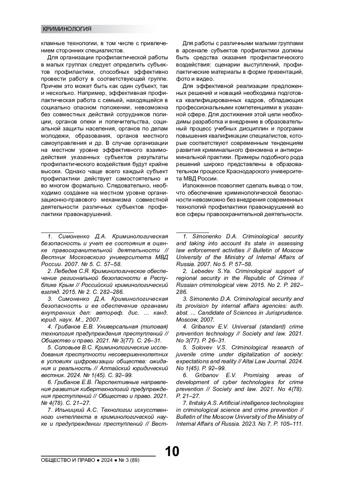 7. Ильницкий А.С. Технологии искусственного интеллекта в криминологической науке и предупреждении преступлений // Вестник Московского университета МВД России. 2023. № 7. С. 105-111. EDN: JXKGSK