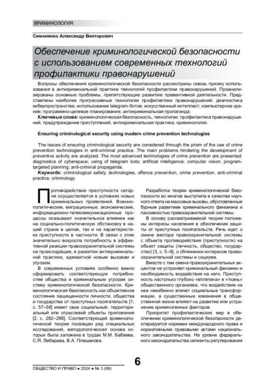 Вопросы обеспечения криминологической безопасности рассмотрены сквозь призму использования в антикриминальной практике технологий профилактики правонарушений. Проанализированы основные проблемы, препятствующие развитию превентивной деятельности. Представлены наиболее прогрессивные технологии профилактики правонарушений: диагностика киберпространства; использование telegram-ботов; искусственный интеллект; компьютерное зрение; программно-целевое планирование; антикриминальная пропаганда