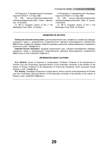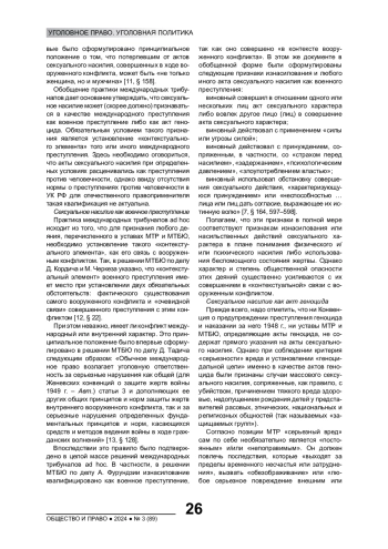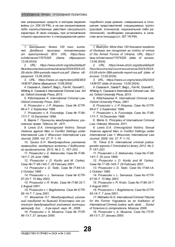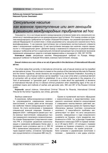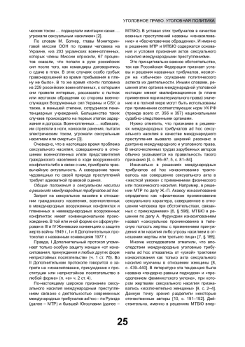 Указывается, что в настоящее время в международном уголовном праве акты сексуального насилия могут квалифицироваться как международные преступления. Этот вывод основан на практике международных трибуналов по Руанде и бывшей Югославии, чьи решения признаются Российской Федерацией. В соответствии с этими решениями акты сексуального насилия могут быть квалифицированы: 1) как военное преступление при установлении контекстуального элемента связи с вооруженным конфликтом; 2) как преступление геноцида при наличии «порога серьезности» и «геноцидальной цели». Делается вывод о возможности опираться на решения международных трибуналов ad hoc в национальной уголовной юрисдикции при установлении признаков применения запрещенных средств и методов ведения войны и геноцида (ст. 356, 357 УК РФ)