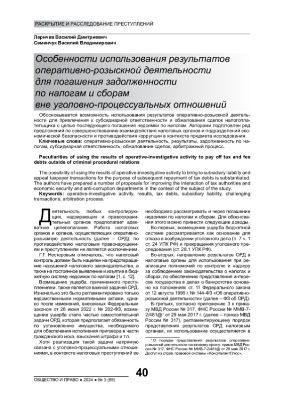 Обосновывается возможность использования результатов оперативно-розыскной деятельности для привлечения к субсидиарной ответственности и обжалования сделок налогоплательщика с целью последующего погашения недоимки по налогам. Авторами подготовлен ряд предложений по совершенствованию взаимодействия налоговых органов и подразделений экономической безопасности и противодействия коррупции в контексте предмета исследования