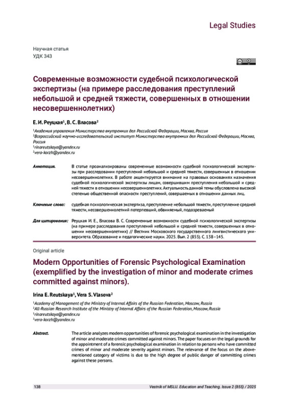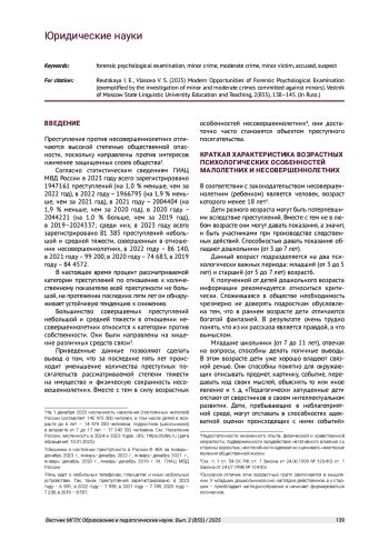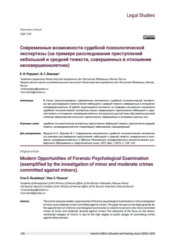 В статье проанализированы современные возможности судебной психологической экспертизы при расследовании преступлений небольшой и средней тяжести, совершенных в отношении несовершеннолетних. В работе акцентируется внимание на правовых основаниях назначения судебной психологической экспертизы лицам, совершившим преступления небольшой и средней тяжести в отношении несовершеннолетних. Актуальность данной темы обусловлена высокой степенью общественной опасности преступлений, совершаемых в отношении данных лиц.