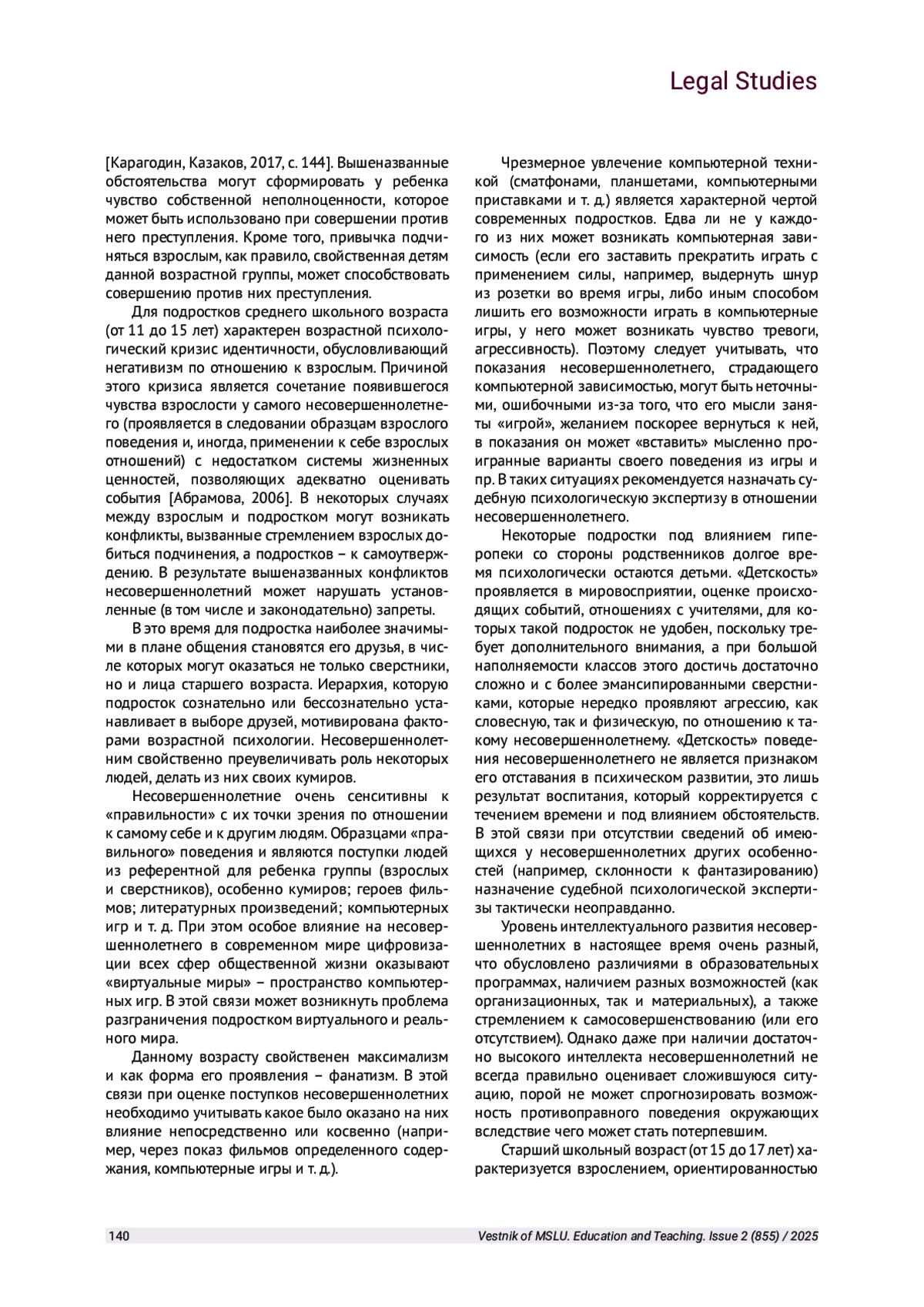 4. Габидуллова Э. Р., Камалиева Л. А. Особенности судебно-психологической экспертизы несовершеннолетних в уголовном процессе // Вопросы современной юриспруденции. 2014. № 36. С. 107-112. URL: https://cyberleninka.ru/article/n/osobennosti-sudebno-psihologicheskoy-ekspertizy-nesovershennoletnih-v-ugolovnom-sudoproizvodstve (дата обращения: 28.03.2024). EDN: SBUAYV