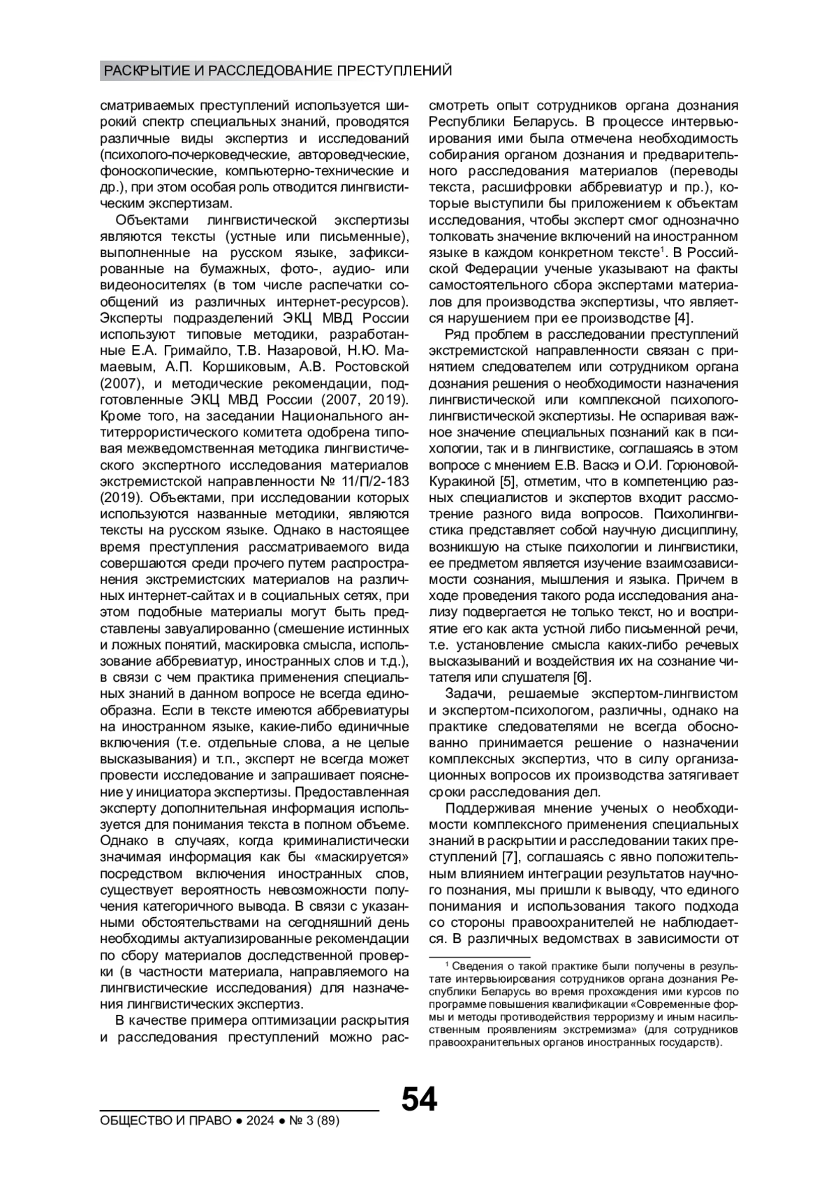 5. Васкэ Е.В., Горюнова-Куракина О.И. Проведение психолого-лингвистической экспертизы при расследовании преступлений экстремистской направленности // Актуальные проблемы гуманитарных и естественных наук. 2015. № 12-4. С. 26-29. EDN: VHHMYD