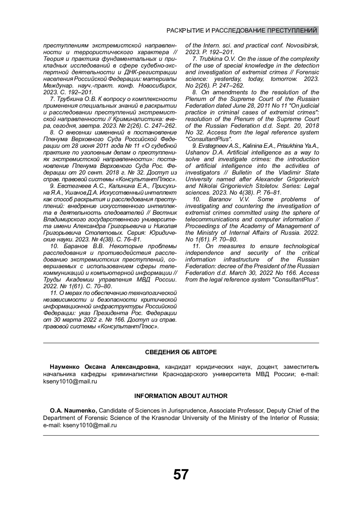 7. Трубкина О.В. К вопросу о комплексности применения специальных знаний в раскрытии и расследовании преступлений экстремистской направленности // Криминалистика: вчера, сегодня, завтра. 2023. № 2(26). С. 247-262. EDN: ZOKBWU