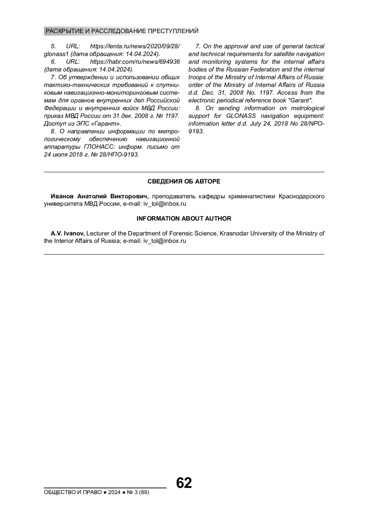 7. Об утверждении и использовании общих тактико-технических требований к спутниковым навигационно-мониторинговым системам для органов внутренних дел Российской Федерации и внутренних войск МВД России: приказ МВД России от 31 дек. 2008 г. № 1197. Доступ из ЭПС “Гарант”.