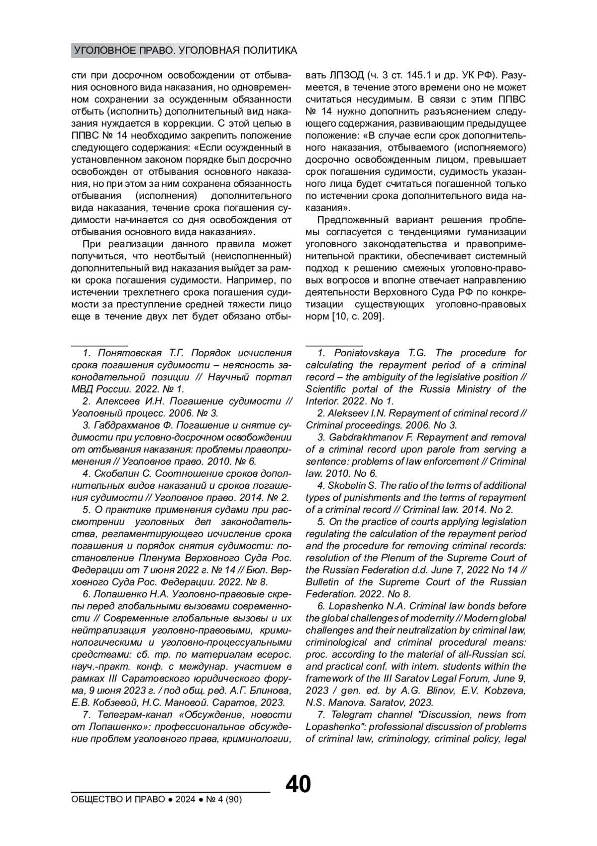 1. Понятовская Т.Г. Порядок исчисления срока погашения судимости - неясность законодательной позиции // Научный портал МВД России. 2022. № 1. EDN: HVXHMQ