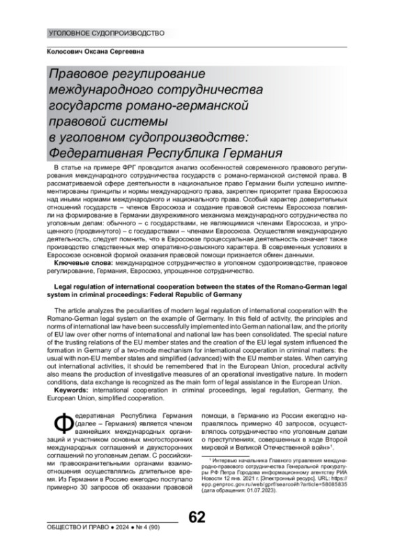 В статье на примере ФРГ проводится анализ особенностей современного правового регулирования международного сотрудничества государств с романо-германской системой права. В рассматриваемой сфере деятельности в национальное право Германии были успешно имплементированы принципы и нормы международного права, закреплен приоритет права Евросоюза над иными нормами международного и национального права. Особый характер доверительных отношений государств – членов Евросоюза и создание правовой системы Евросоюза повлияли на формирование в Германии двухрежимного механизма международного сотрудничества по уголовным делам: обычного – с государствами, не являющимися членами Евросоюза, и упрощенного (продвинутого) – с государствами – членами Евросоюза. Осуществляя международную деятельность, следует помнить, что в Евросоюзе процессуальная деятельность означает также производство следственных мер оперативно-розыскного характера. В современных условиях в Евросоюзе основной формой оказания правовой помощи признается обмен данными.