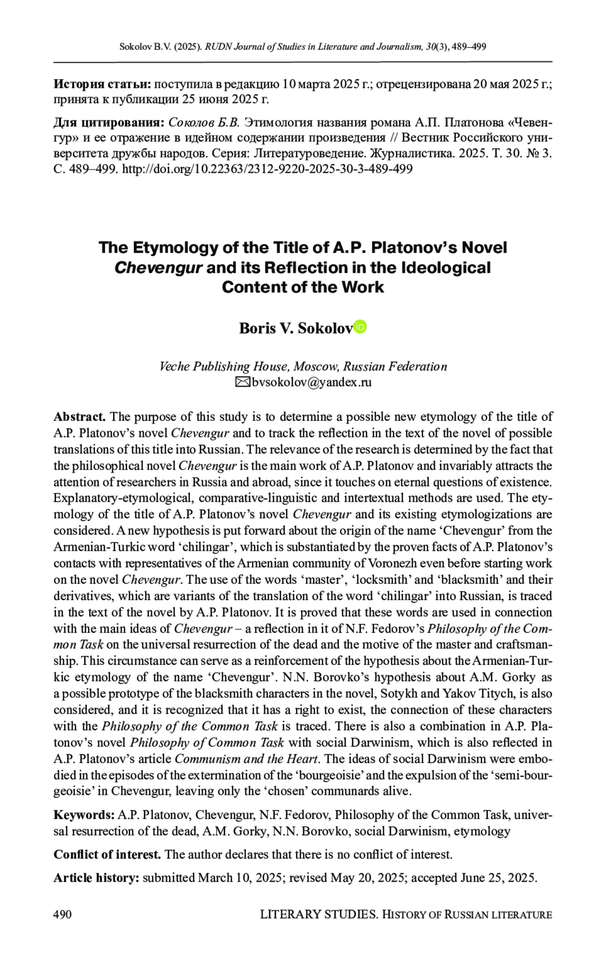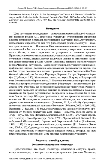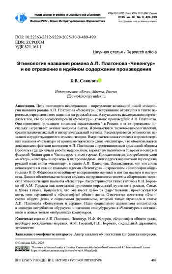 Цель настоящего исследования - определение возможной новой этимологии названия романа А. П. Платонова «Чевенгур», отслеживание отражения в тексте вероятных переводов этого названия на русский язык. Актуальность исследования определяется тем, что философский роман «Чевенгур» - главное произведение А. П. Платонова. Оно неизменно привлекает внимание исследователей в России и за ее пределами, поскольку затрагивает вечные вопросы бытия. Используются толково-этимологический, сравнительно-языковый и интертекстуальный методы. Рассматривается этимология названия и существующие его этимологизации. Выдвигается новая гипотеза о происхождении названия «Чевенгур» от армянско-тюркского слова «чилингар», что обосновывается доказанными фактами контактов А. П. Платонова с представителями армянской общины Воронежа еще до начала работы над романом, вероятным наличием в то время носителей фамилий Чилингарян и Чилингаров в этом городе. Прослеживается употребление слов «мастер», «слесарь» и «кузнец» и их производных, являющихся вариантами перевода на русский язык слова «чилингар», в тексте А. П. Платонова. Доказывается, что эти слова используются в связи с главными идеями «Чевенгура» - отражением «Философии общего дела» Н. Ф. Фёдорова по всеобщему воскрешению мертвых и мотива мастера и мастерства. Данное обстоятельство может служить подкреплением гипотезы об армянско-тюркской этимологизации названия «Чевенгур». Рассматривается также гипотеза Н. Н. Боровко об А. М. Горьком как возможном прототипе персонажей-кузнецов в романе, Сотых и Якова Титыча, признается, что она имеет право на существование, прослеживается связь этих персонажей с «Философией общего дела». Отмечается сочетание «Философии общего дела» с социальным дарвинизмом, который также отразился в статье А. П. Платонова «Коммунизм и сердце». Идеи социального дарвинизма воплотились в эпизодах истребления «буржуев» и изгнания «полубуржуев» в «Чевенгуре» с оставлением в живых только «избранных» коммунаров.