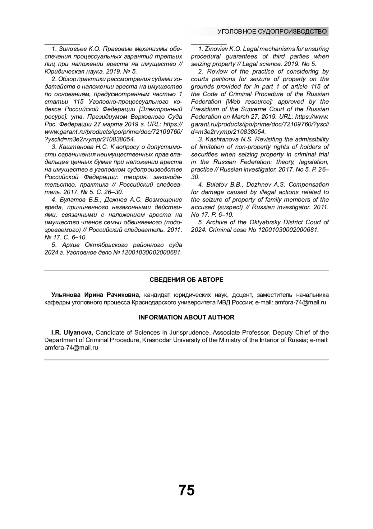 1. Зиновьев К.О. Правовые механизмы обеспечения процессуальных гарантий третьих лиц при наложении ареста на имущество // Юридическая наука. 2019. № 5. EDN: QEGMDO