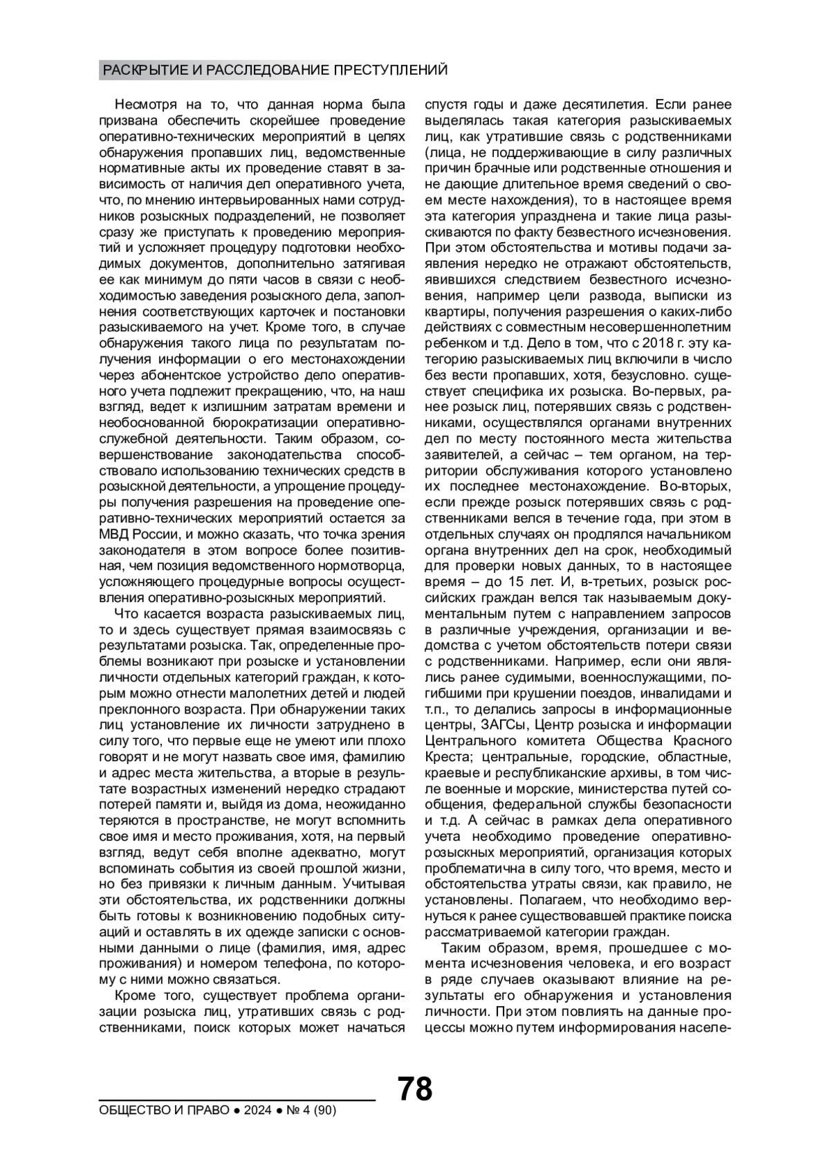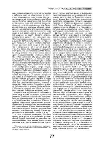 В оперативно-розыскной деятельности течение времени имеет подчас решающее значение в процессе проведения оперативно-розыскных мероприятий и раскрытия неочевидных преступлений, в том числе при осуществлении розыскной деятельности в отношении без вести пропавших лиц. Анализ статистических данных за последние 10 лет свидетельствует о том, что число поступивших заявлений в отношении этой категории лиц увеличилось со 120 до 190 тыс. в год, при этом от 82,1% до 93,5% граждан 1, как правило, обнаруживается в период исполнения проверочных мероприятий до 10 суток без официального объявления розыска, а количество лиц, объявленных в розыск в связи с безвестным исчезновением с заведением дел оперативного учета, снизилось практически в 2,6 раза, и в прошлом году с учетом остатка за последние 15 лет в розыске находилось 36,3 тыс. чел.2