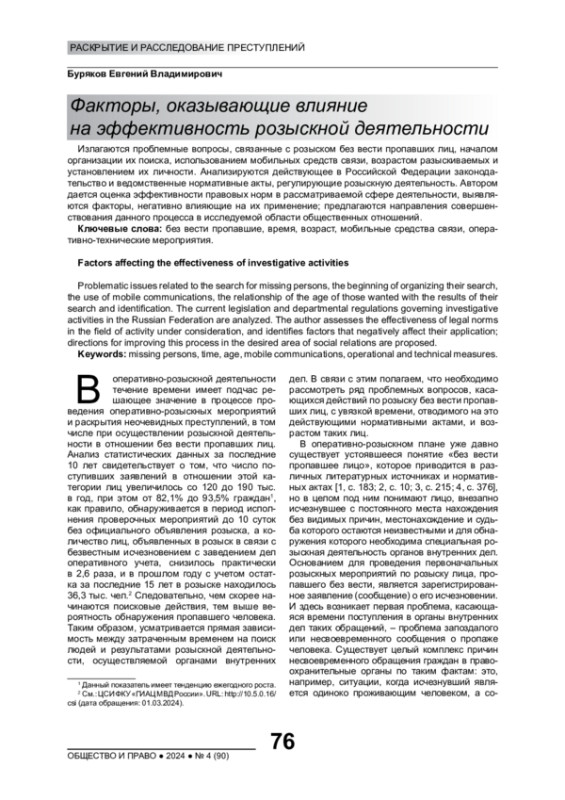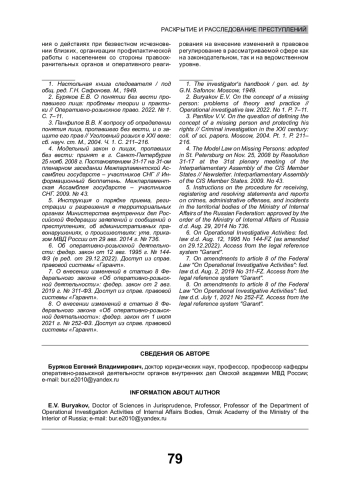 2. Буряков Е.В. О понятии без вести пропавшего лица: проблемы теории и практики // Оперативно-розыскное право. 2022. № 1. С. 7-11. EDN: LUZAAR