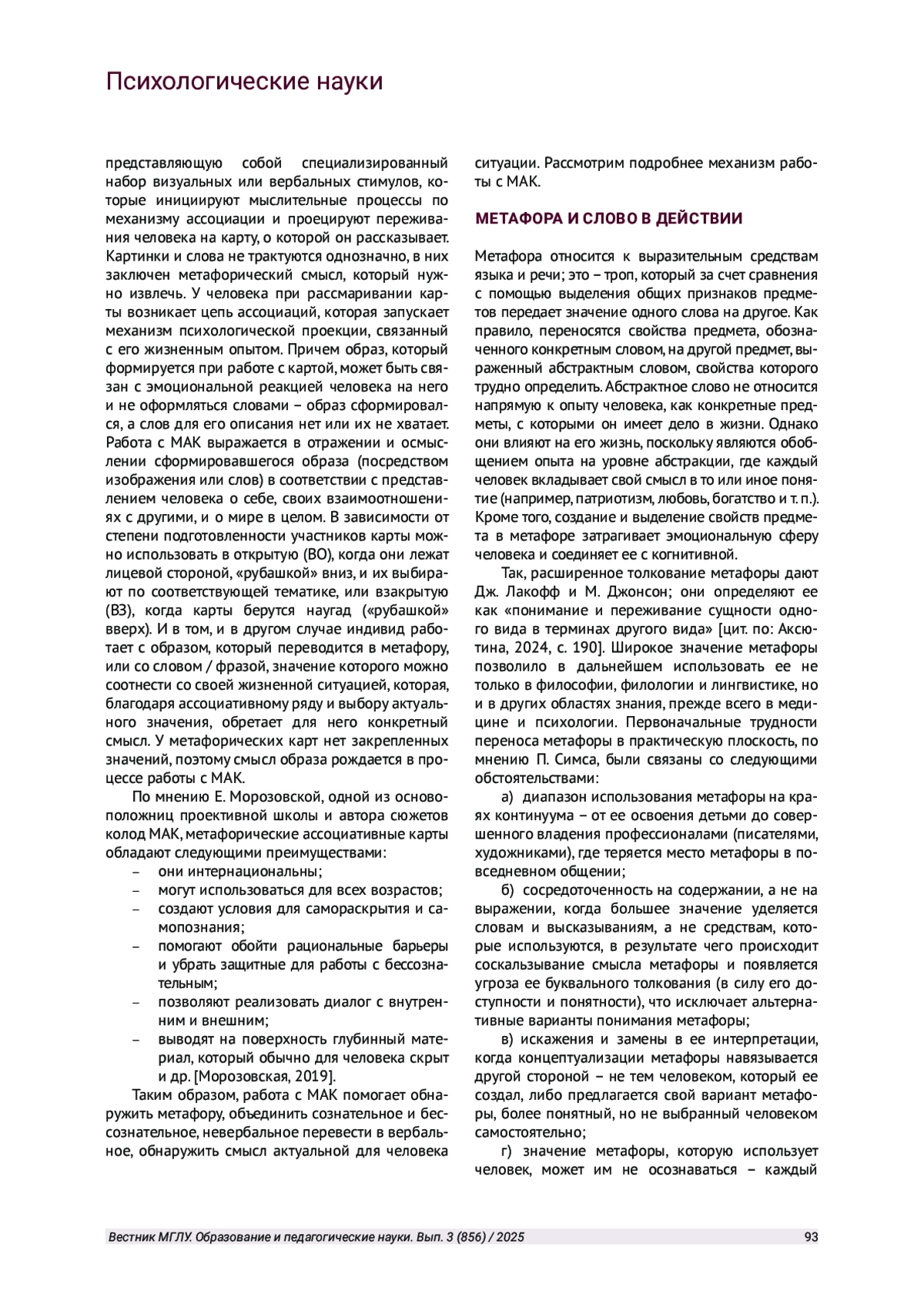В практической работе психолога и педагога- психолога появляются и успешно применяются новые инструменты работы. К таким инструментам относятся метафорические ассоциативные карты (МАК) [Кац, Махаматулина, 2025]. Однако их применение в образовании и теоретико-методологическое осмысление остается малоизученным. Как правило, применение МАК ограничивается консультативной практикой [Дмитриева, Буравцова, 2021], в то время как их потенциал, на наш взгляд, гораздо шире, что позволяет использовать этот инструмент в образовательном процессе. Это связано с целым рядом обстоятельств.