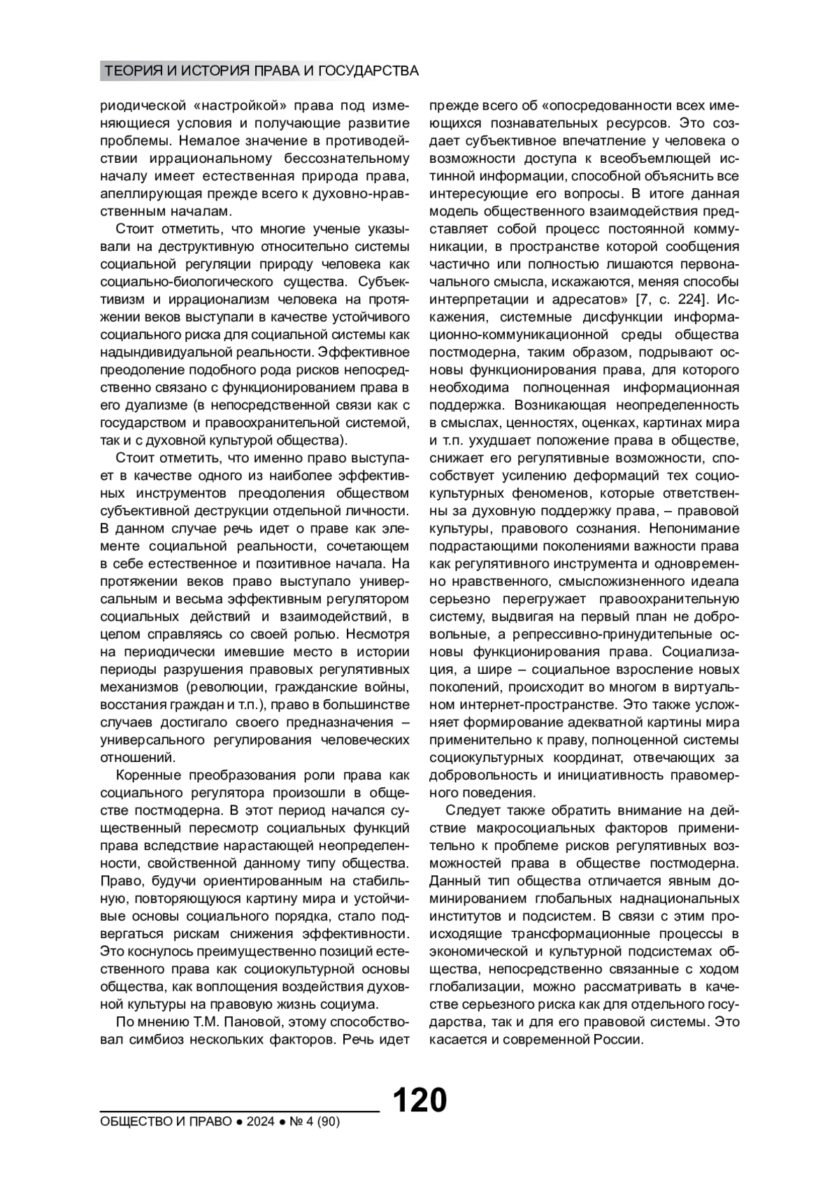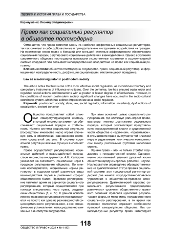 Отмечается, что право является одним из наиболее эффективных социальных регуляторов, так как сочетает в себе добровольные и принудительные инструменты воздействия на граждан. На протяжении веков право с большей или меньшей степенью эффективности обеспечивало социальный порядок, регулировало социальные действия и взаимодействия. Однако в условиях современного общества постмодерна произошли существенные изменения в социокультурной системе координат, что оказывает непосредственное воздействие на право как социальный регулятор.