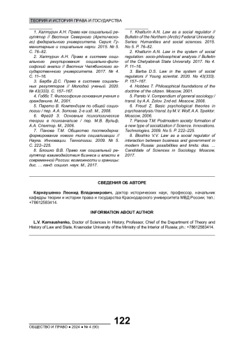 3. Барба Д.С. Право в системе социальных регуляторов // Молодой ученый. 2020. № 43(333). С. 157-167. EDN: CHMDQZ
