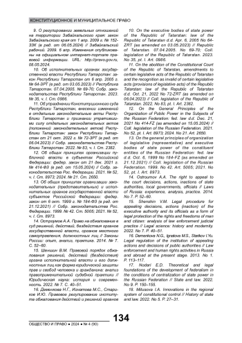 11. Об упразднении Конституционного суда Республики Татарстан, внесении изменений в отдельные законодательные акты Республики Татарстан и признании утратившими силу отдельных законодательных актов (положений законодательных актов) Республики Татарстан: закон Республики Татарстан от 21 окт. 2022 г. № 72-ЗРТ (в ред. от 06.04.2023) // Собр. законодательства Республики Татарстан. 2022. № 83, ч. I. Ст. 2382.