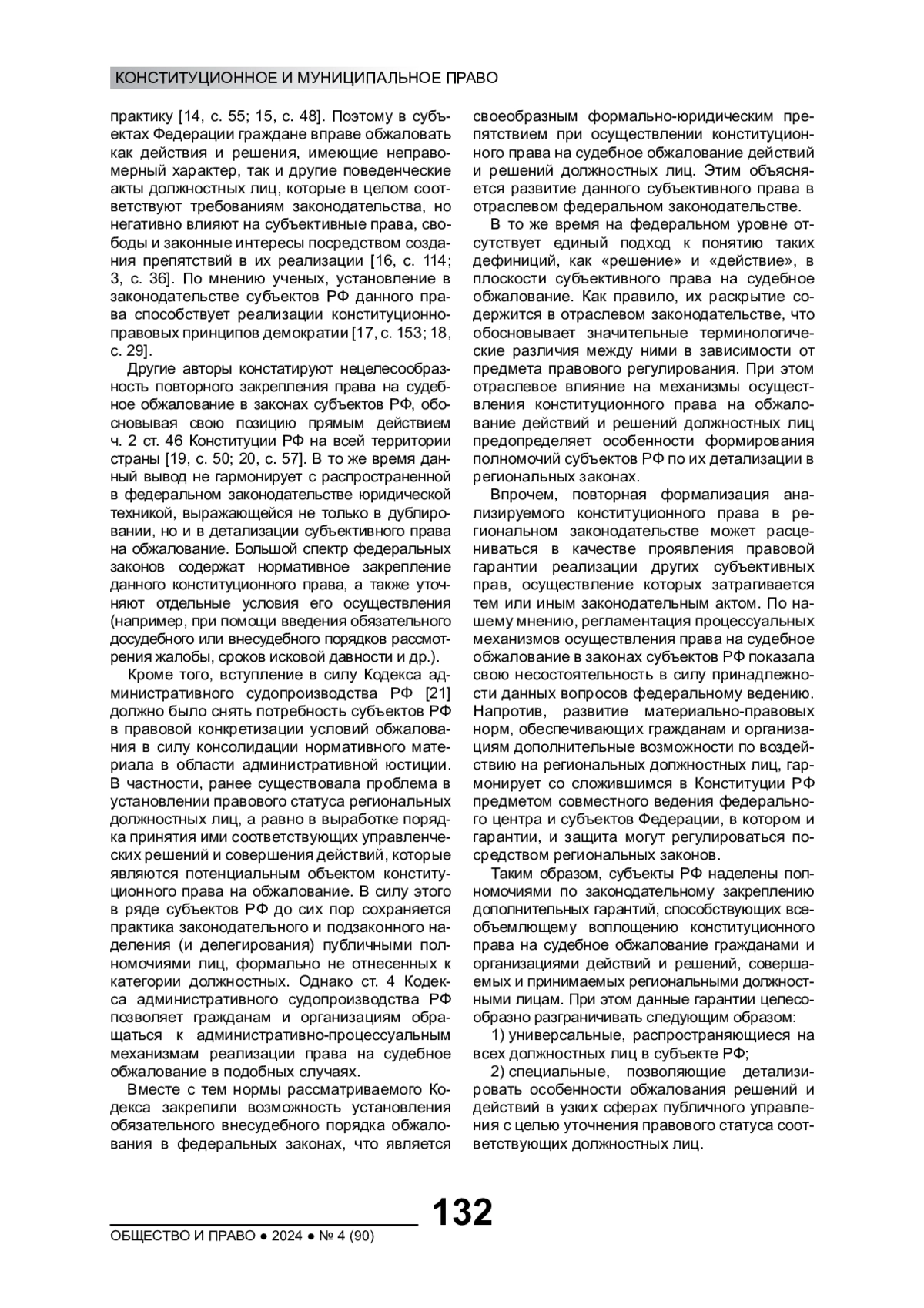 Субъективное право, предусмотренное ч. 2 ст. 46 Конституции РФ, представляет собой общеправовую гарантию реализации многих конституционных прав граждан и организаций при взаимодействии с институтами публичного управления. Несмотря на явный процессуально-правовой характер механизмов его реализации [1, с. 91; 2, с. 86], оно также подвержено влиянию материально-правовых норм [3, с. 35; 4, с. 17], часть из которых в силу федеративного устройства государства содержится в законодательстве субъектов РФ