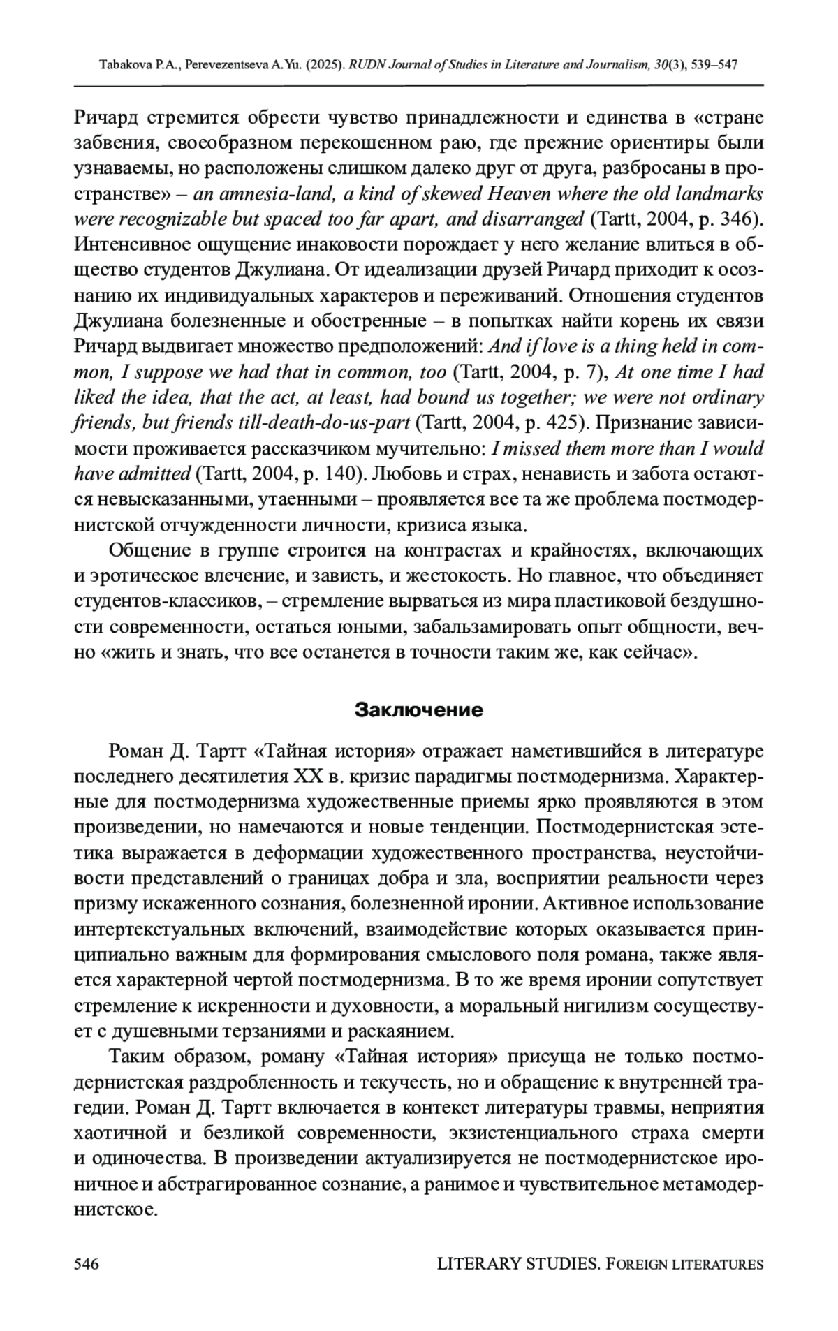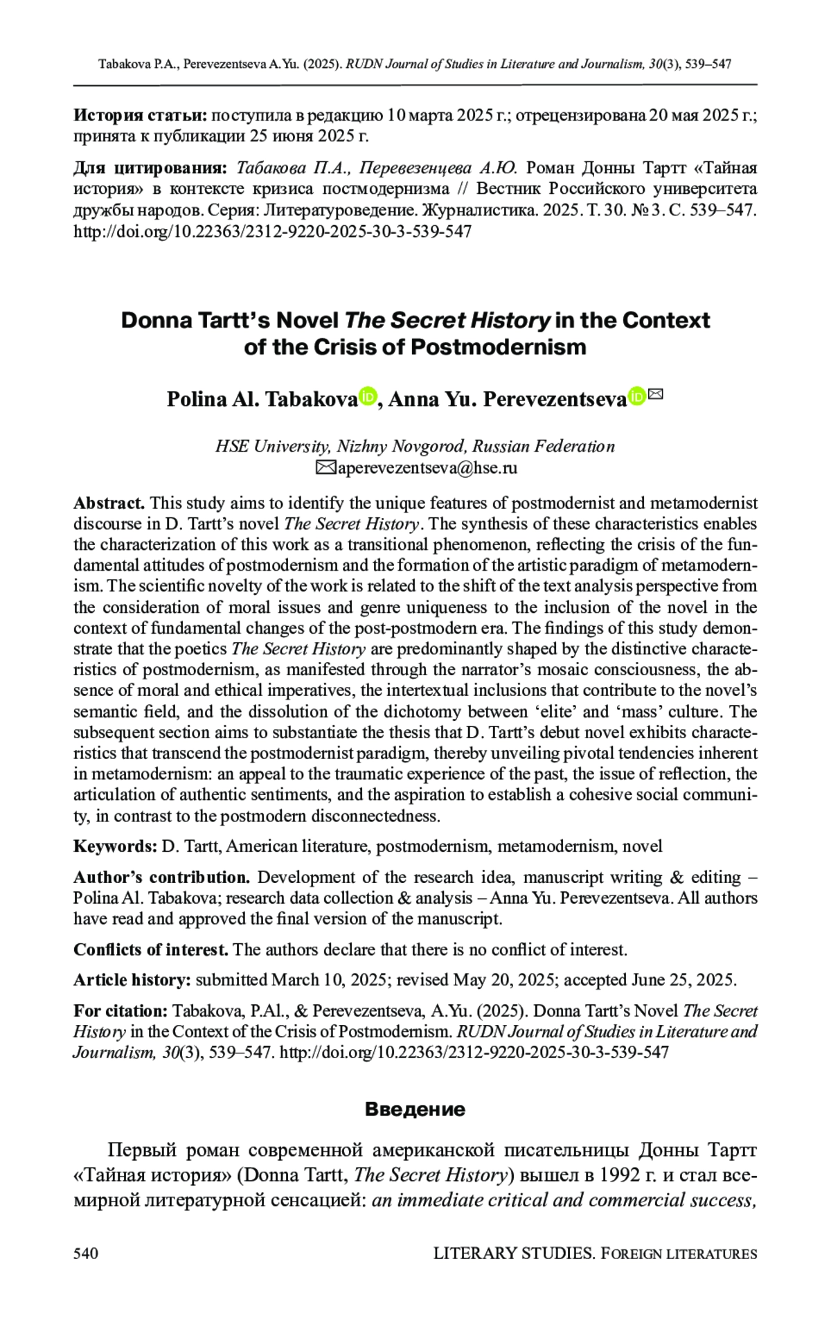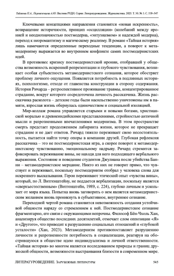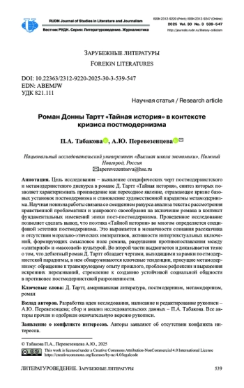 Цель исследования - выявление специфических черт постмодернистского и метамодернистского дискурса в романе Д. Тартт «Тайная история», синтез которых позволяет характеризовать произведение как переходное явление, отражающее кризис базовых установок постмодернизма и становление художественной парадигмы метамодернизма. Научная новизна работы связана со смещением ракурса анализа текста с рассмотрения нравственной проблематики и жанрового своеобразия на включение романа в контекст фундаментальных изменений эпохи пост-постмодернизма. Проведенное исследование позволяет сделать вывод, что поэтика «Тайной истории» во многом определяется спецификой эстетики постмодернизма. Это выражается в мозаичности сознания рассказчика и отсутствии морально-этических императивов, активности интертекстуальных включений, формирующих смысловое поле романа, разрушении противопоставления между «элитарной» и «массовой» культурой. Во второй части выдвигается и доказывается тезис о том, что дебютный роман Д. Тартт обладает чертами, выходящими за рамки постмодернистской парадигмы, в нем обнаруживаются ключевые тенденции, присущие метамодернизму: обращение к травмирующему опыту прошлого, проблеме рефлексии и выражения искренних переживаний, стремление к созданию устойчивой социальной общности в противовес постмодернистской разрозненности.