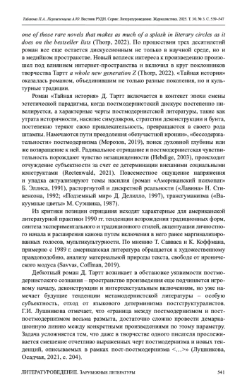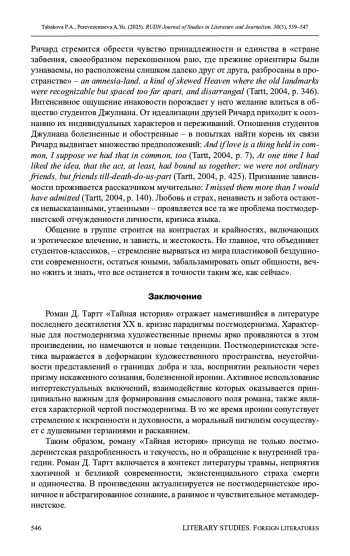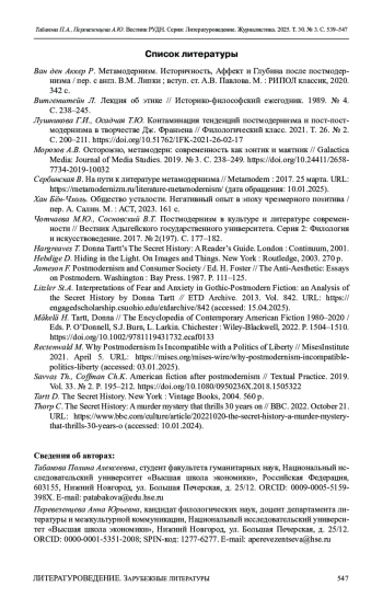 11. Litzler St.A. Interpretations of Fear and Anxiety in Gothic-Postmodern Fiction: an Analysis of the Secret History by Donna Tartt // ETD Archive. 2013. Vol. 842. URL: https://engagedscholarship.csuohio.edu/etdarchive/842 (accessed: 15.04.2025).