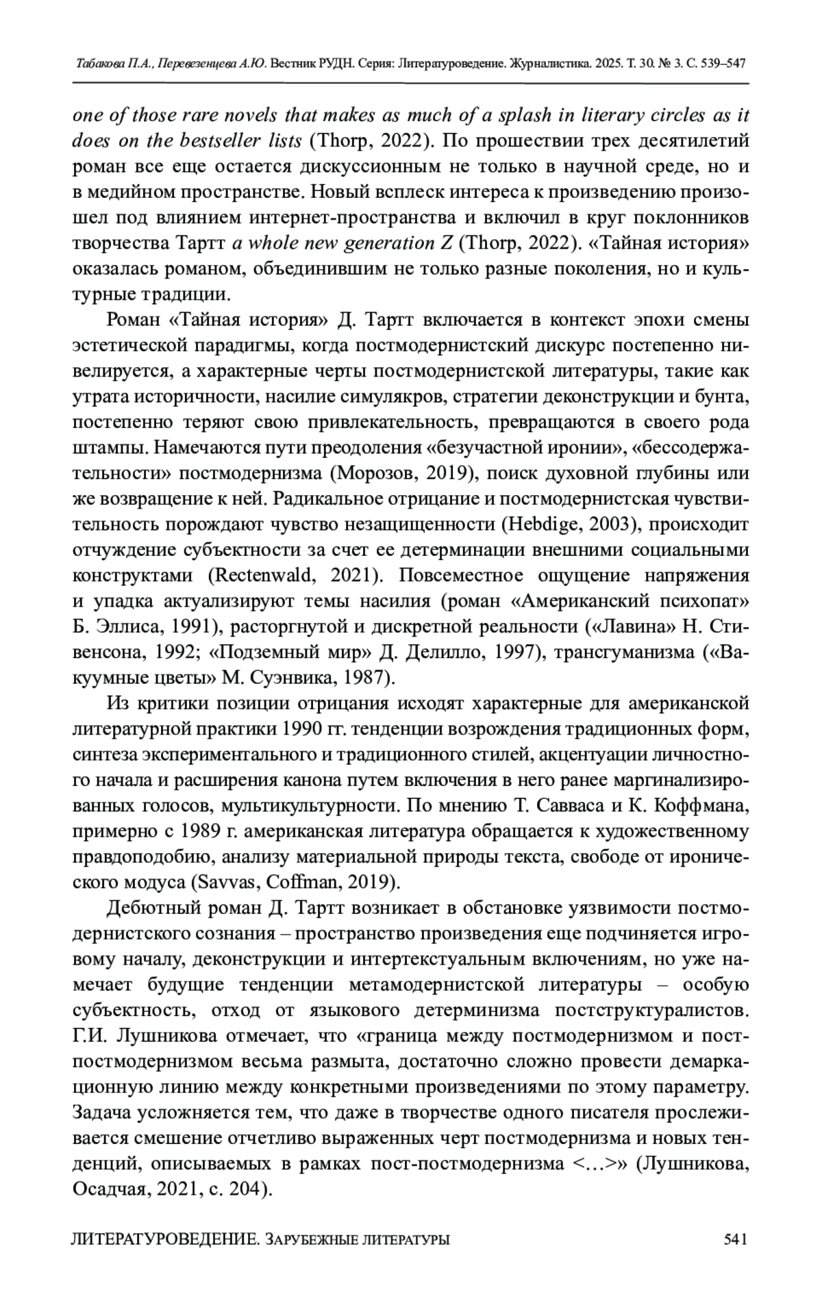 3. Лушникова Г.И., Осадчая Т.Ю. Контаминация тенденций постмодернизма и пост-постмодернизма в творчестве Дж. Франзена // Филологический класс. 2021. Т. 26. № 2. С. 200-211. DOI: 10.51762/1FK-2021-26-02-17 EDN: EQUQGF