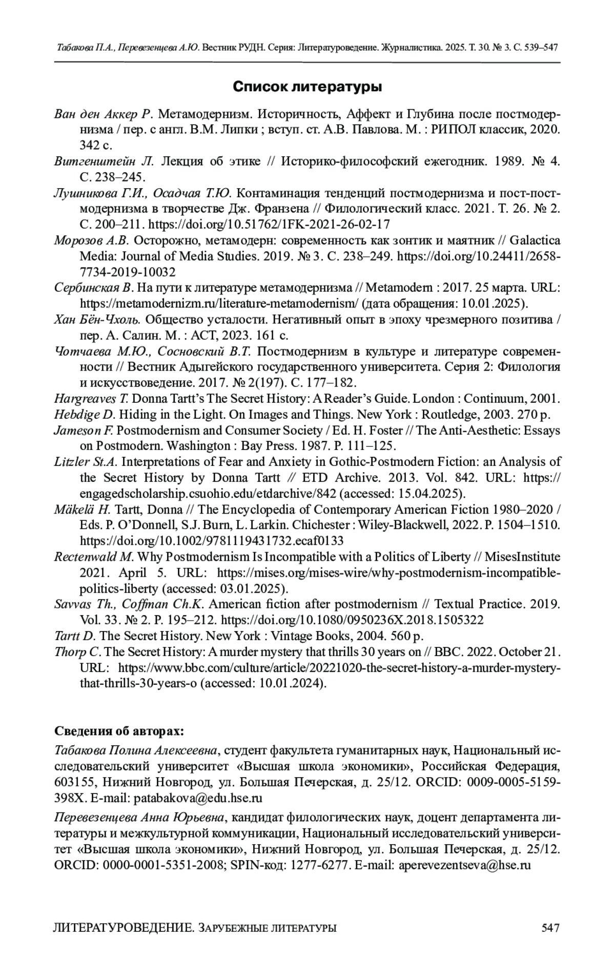 1. Ван ден Аккер Р. Метамодернизм. Историчность, Аффект и Глубина после постмодернизма / пер. с англ. В.М. Липки; вступ. ст. А.В. Павлова. М.: РИПОЛ классик, 2020. 342 с.