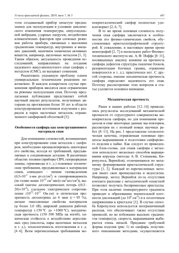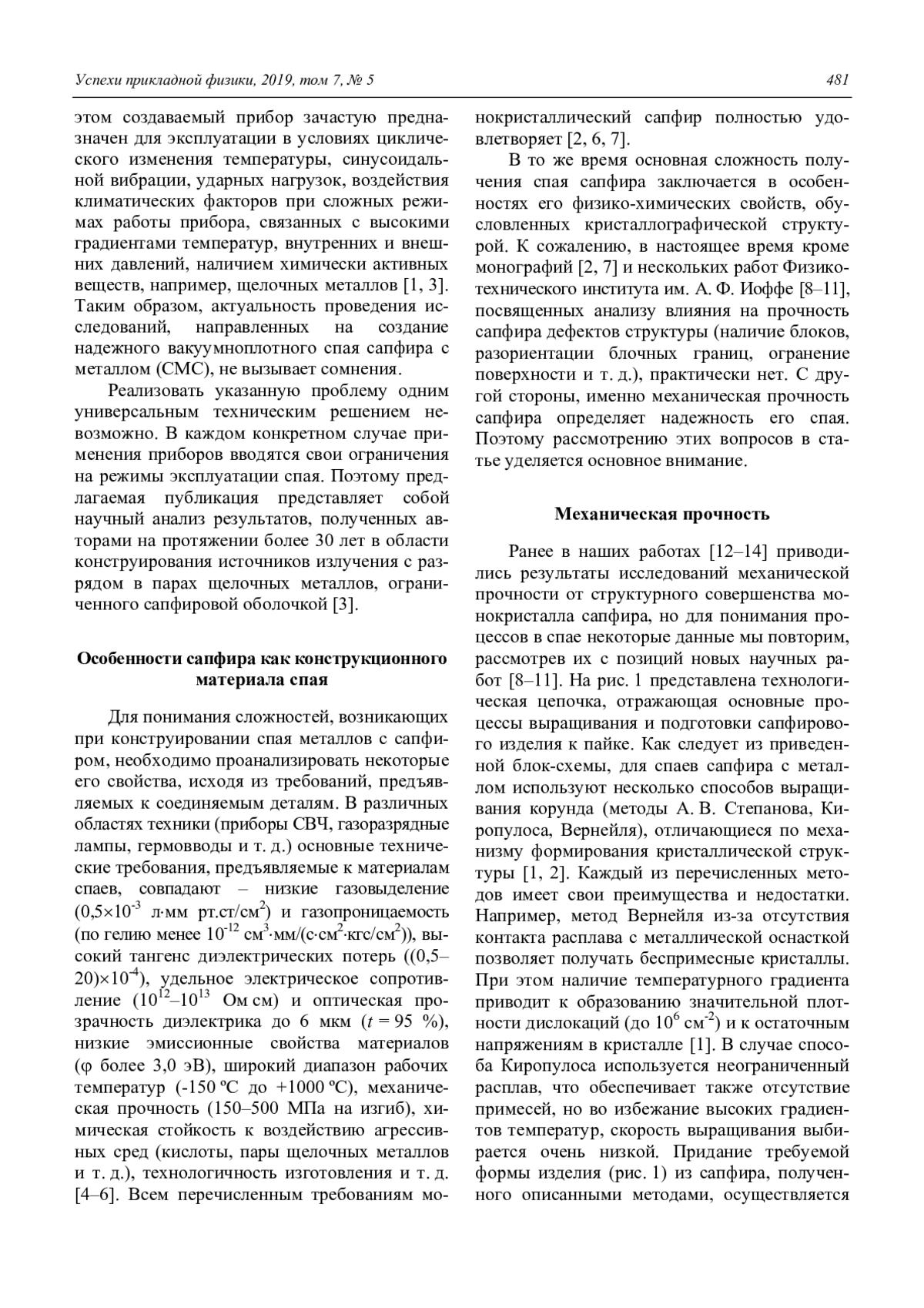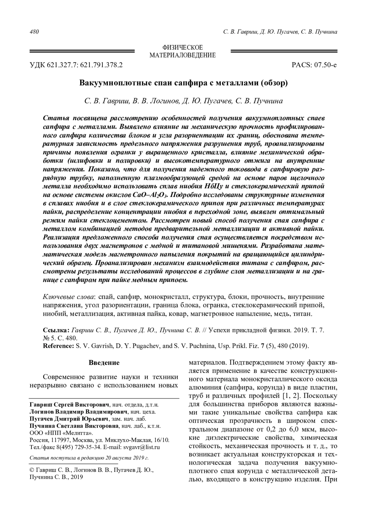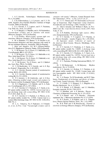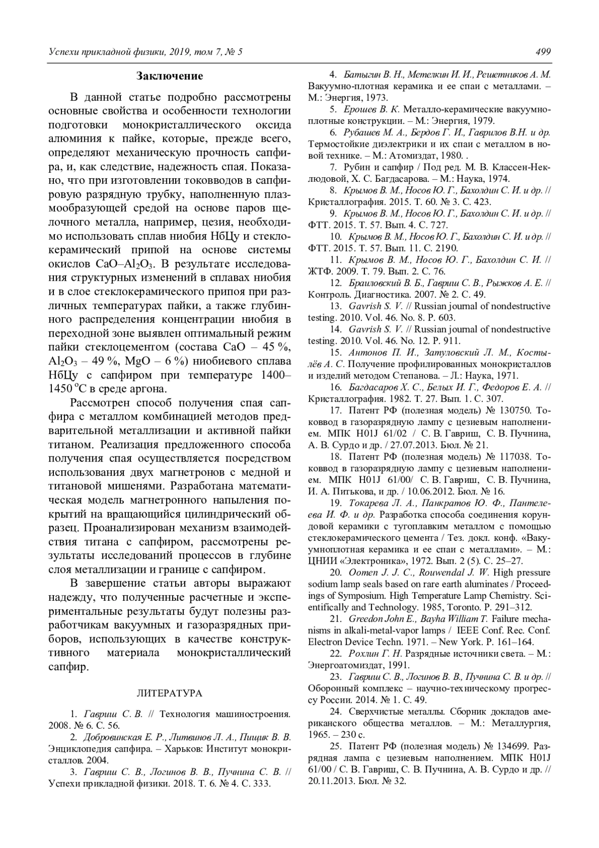 Статья посвящена рассмотрению особенностей получения вакуумноплотных спаев сапфира с металлами. Выявлено влияние на механическую прочность профилированного сапфира количества блоков и угла разориентации их границ, обоснована температурная зависимость предельного напряжения разрушения труб, проанализированы причины появления огранки у выращенного кристалла, влияние механической обработки (шлифовки и полировки) и высокотемпературного отжига на внутренние напряжения. Показано, что для получения надежного токоввода в сапфировую разрядную трубку, наполненную плазмообразующей средой на основе паров щелочного металла необходимо использовать сплав ниобия НбЦу и стеклокерамический припой на основе системы окислов CaO–Al2O3. Подробно исследованы структурные изменения в сплавах ниобия и в слое стеклокерамического припоя при различных температурах пайки, распределение концентрации ниобия в переходной зоне, выявлен оптимальный режим пайки стеклоцементом. Рассмотрен новый способ получения спая сапфира с металлом комбинацией методов предварительной металлизации и активной пайки. Реализация предложенного способа получения спая осуществляется посредством использования двух магнетронов с медной и титановой мишенями. Разработана математическая модель магнетронного напыления покрытий на вращающийся цилиндрический образец. Проанализирован механизм взаимодействия титана с сапфиром, рассмотрены результаты исследований процессов в глубине слоя металлизации и на границе с сапфиром при пайке медным припоем.