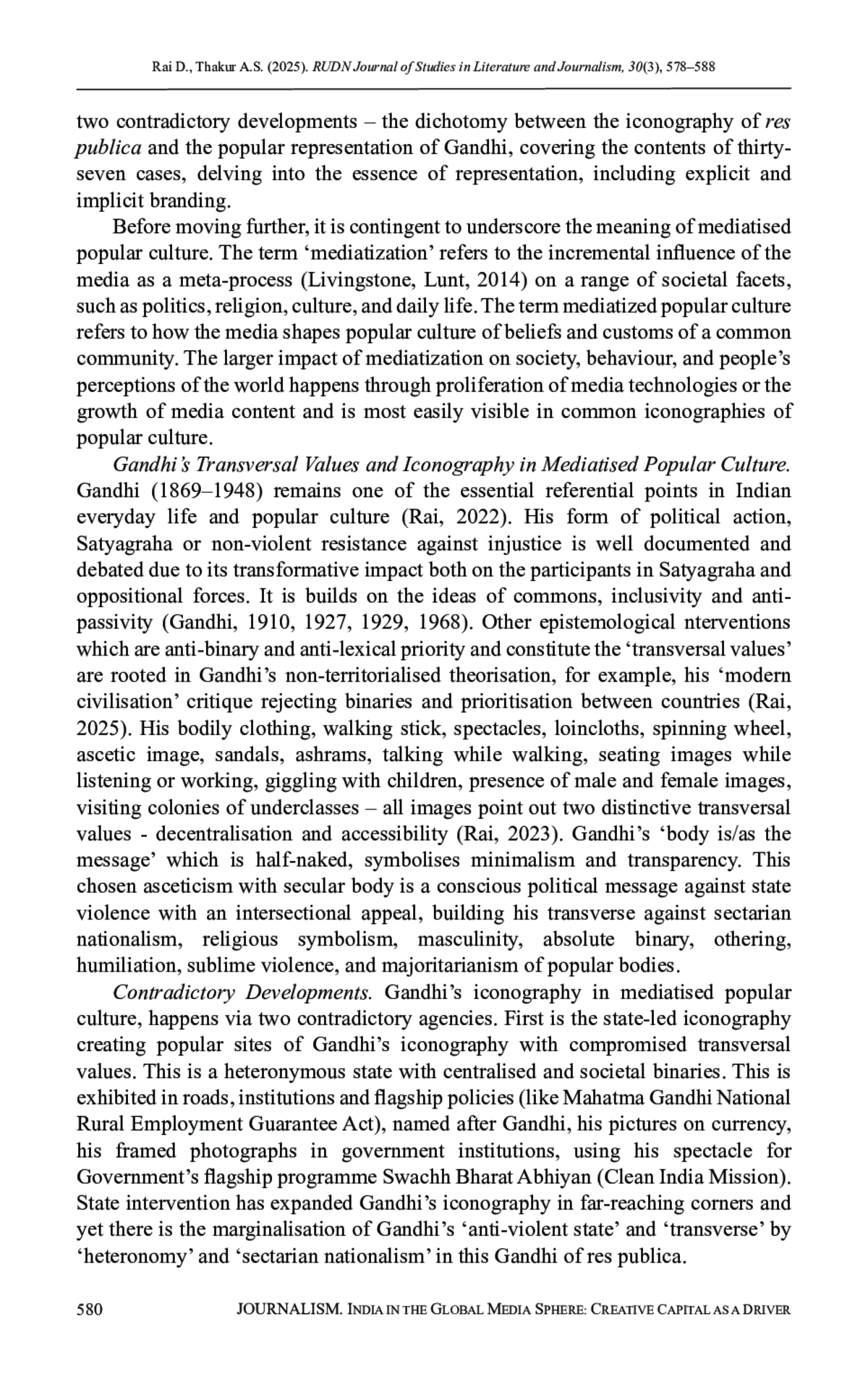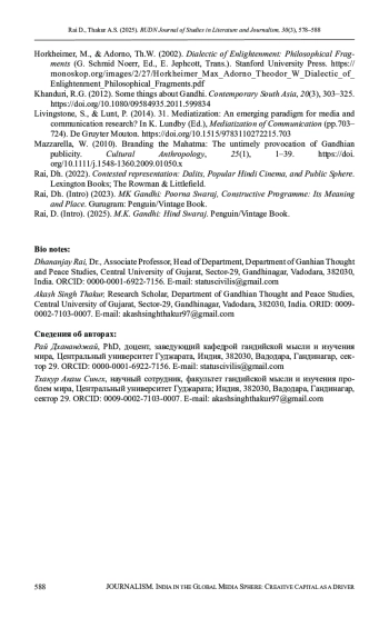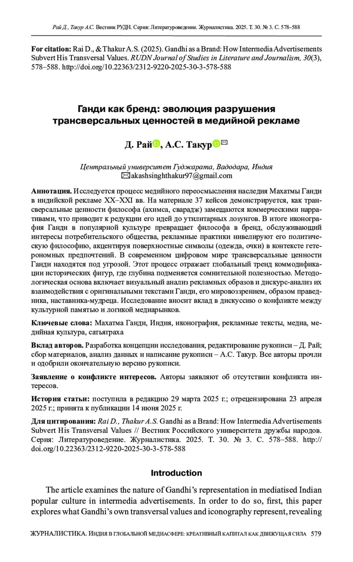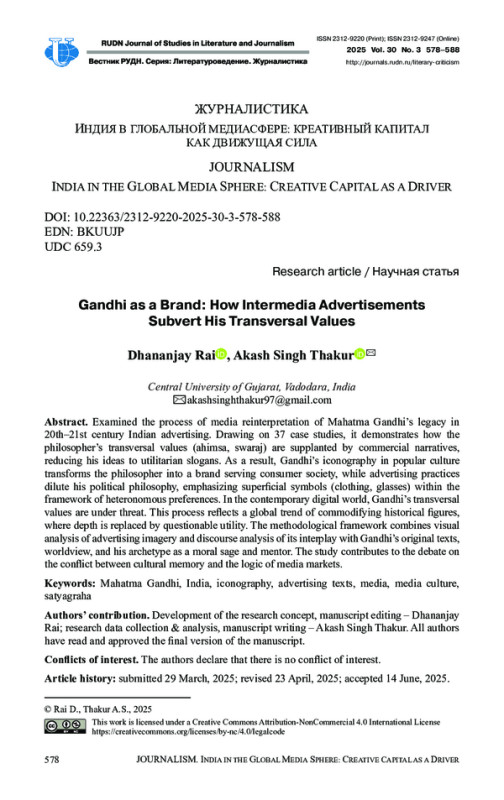 Examined the process of media reinterpretation of Mahatma Gandhi’s legacy in 20th-21st century Indian advertising. Drawing on 37 case studies, it demonstrates how the philosopher’s transversal values (ahimsa, swaraj) are supplanted by commercial narratives, reducing his ideas to utilitarian slogans. As a result, Gandhi’s iconography in popular culture transforms the philosopher into a brand serving consumer society, while advertising practices dilute his political philosophy, emphasizing superficial symbols (clothing, glasses) within the framework of heteronomous preferences. In the contemporary digital world, Gandhi’s transversal values are under threat. This process reflects a global trend of commodifying historical figures, where depth is replaced by questionable utility. The methodological framework combines visual analysis of advertising imagery and discourse analysis of its interplay with Gandhi’s original texts, worldview, and his archetype as a moral sage and mentor. The study contributes to the debate on the conflict between cultural memory and the logic of media markets.