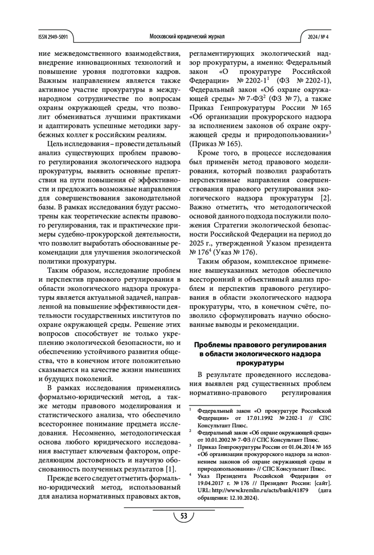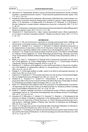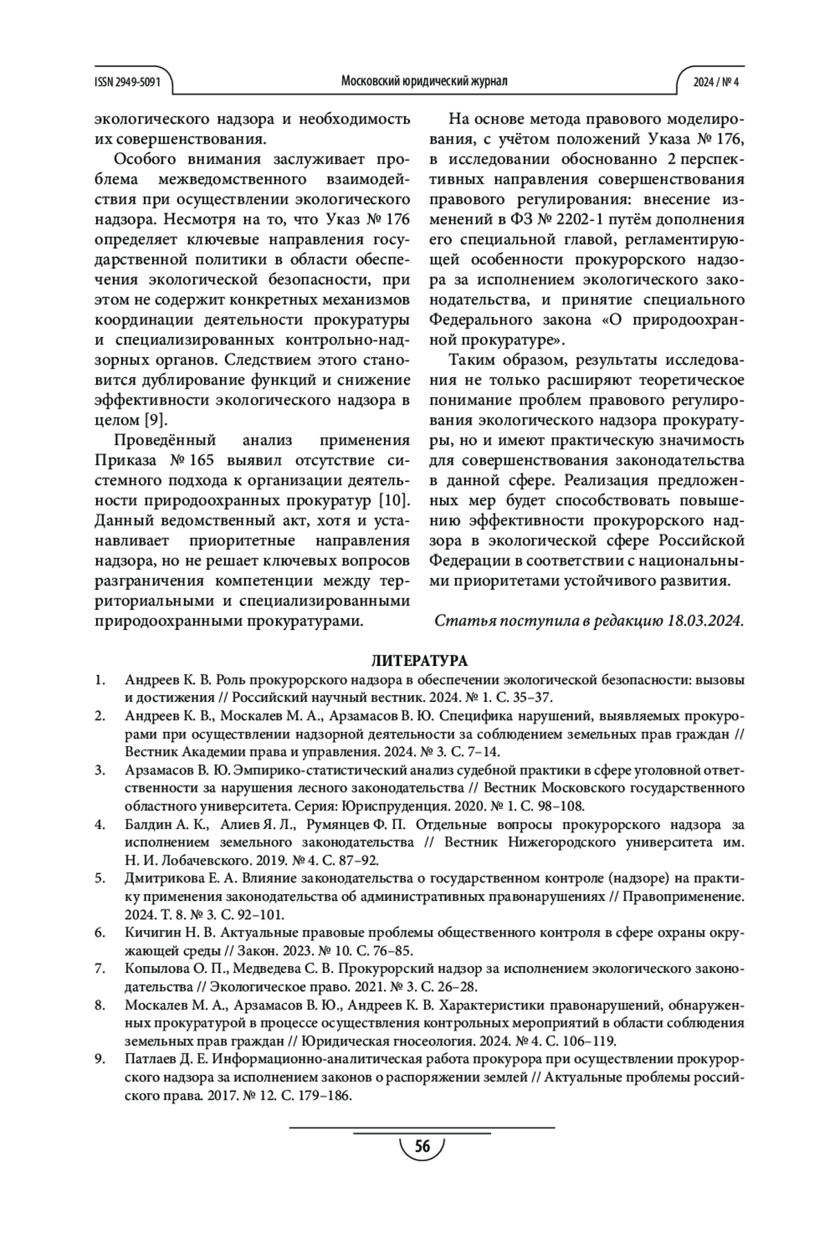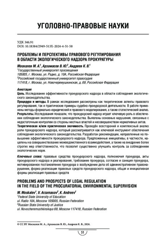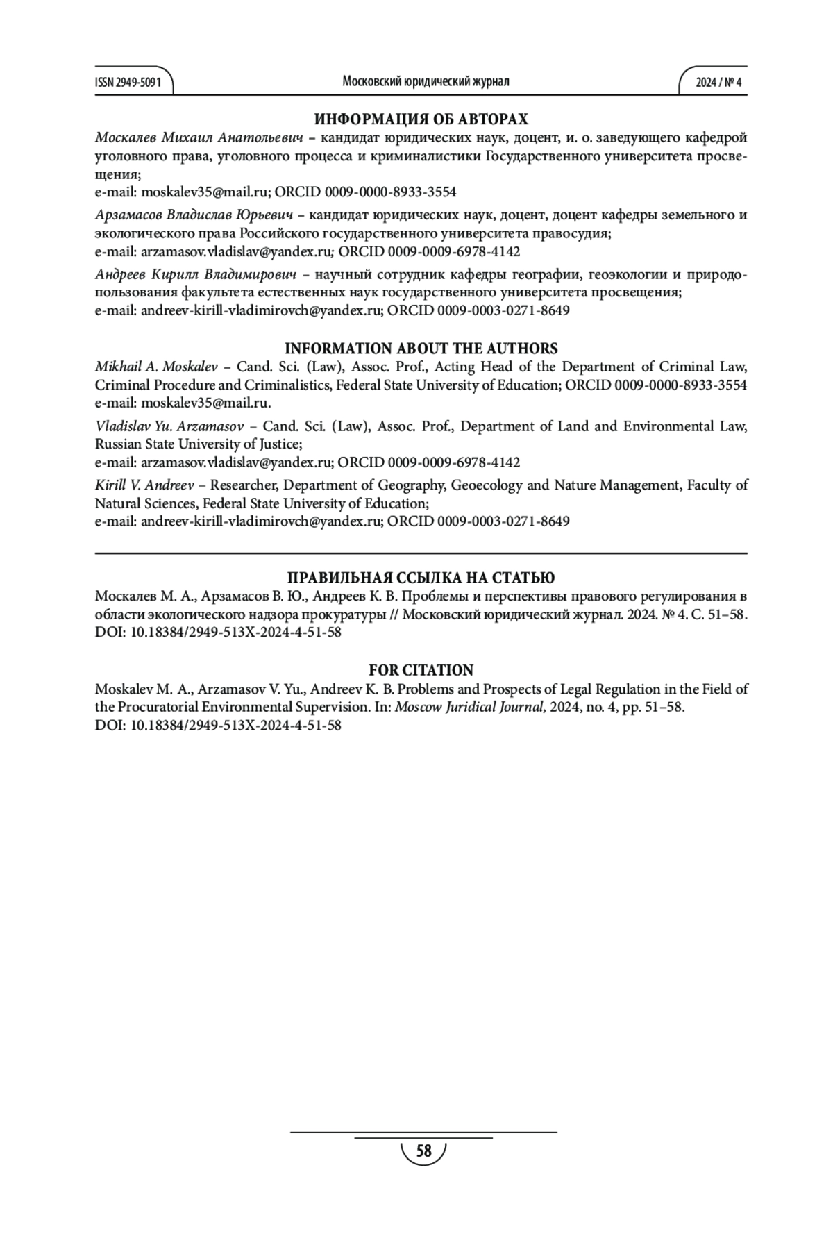МОСКАЛЕВ М. А., АРЗАМАСОВ В. Ю., АНДРЕЕВ К. В. ПРОБЛЕМЫ И ПЕРСПЕКТИВЫ ПРАВОВОГО РЕГУЛИРОВАНИЯ В ОБЛАСТИ ЭКОЛОГИЧЕСКОГО НАДЗОРА ПРОКУРАТУРЫ // МОСКОВСКИЙ ЮРИДИЧЕСКИЙ ЖУРНАЛ. 2024. 2024 / №4
