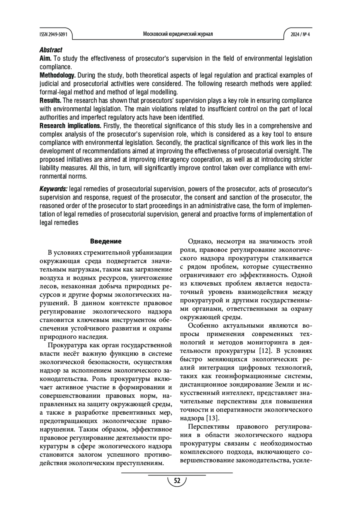 Статья: Проблемы и перспективы правового регулирования в области экологического надзора прокуратуры (2024)