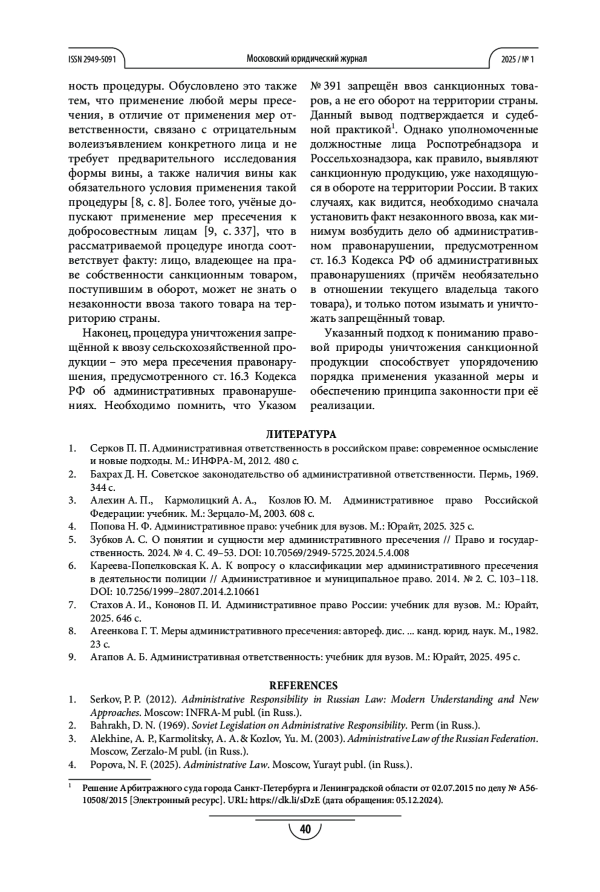 7. Стахов А. И., Кононов П. И. Административное право России: учебник для вузов. М.: Юрайт, 2025. 646 с.