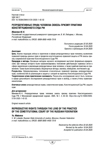 Цель. Анализ подходов учёных и практиков в сфере репродуктивных прав человека, выявление правовой природы данных прав и пределов конституционно-правовой защиты в РФ сквозь призму современной практики Конституционного Суда РФ.