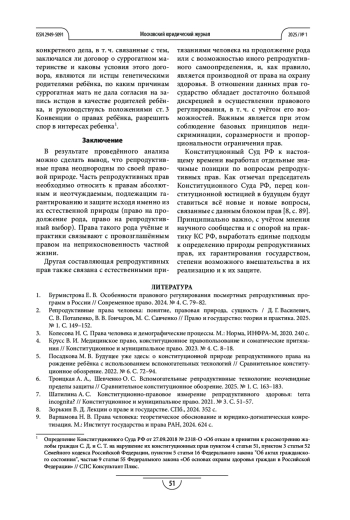 6. Троицкая А. А., Шевченко О. С. Вспомогательные репродуктивные технологии: неочевидные пределы защиты // Сравнительное конституционное обозрение. 2025. № 1. С. 163-183.