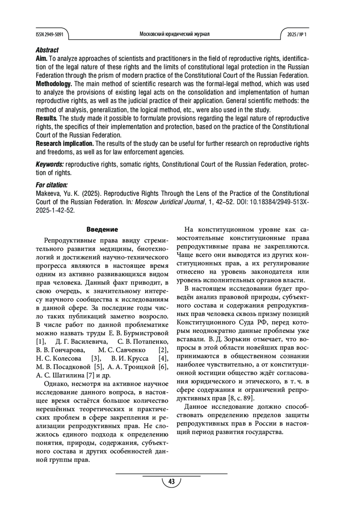 Процедура и методы. Основным методом научного исследования выступил формально-юридический, при помощи которого были проанализированы положения действующих правовых актов в сфере закрепления и реализации репродуктивных прав человека, а также судебная практика их применения. Также были использованы общенаучные методы: анализа, обобщения, логический и др.