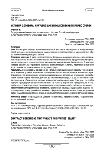 Теоретическая и/или практическая значимость. Предложения и выводы, содержащиеся в данной статье, могут лечь в основу дальнейшего изучения в сфере исследования условий договора, нарушающих баланс имущественных интересов сторон, в зависимости от сферы возникновения договорных связей.