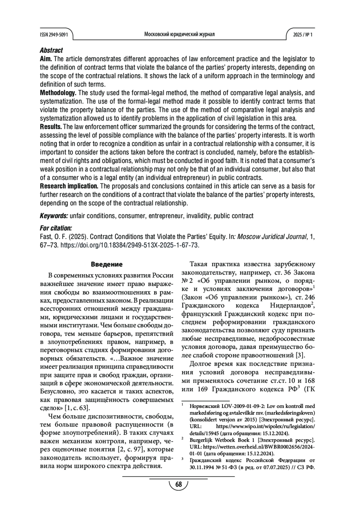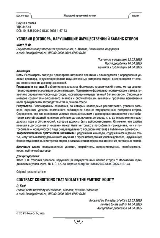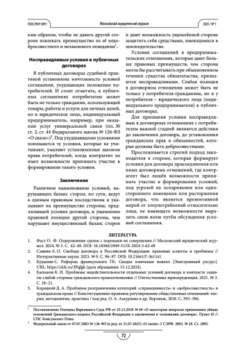 9. Качалин А. П. Проблемы защиты предпринимателя как слабой стороны договора от навязывания несправедливых договорных условий // Аграрное и земельное право. 2024. № 4. С. 245-247.