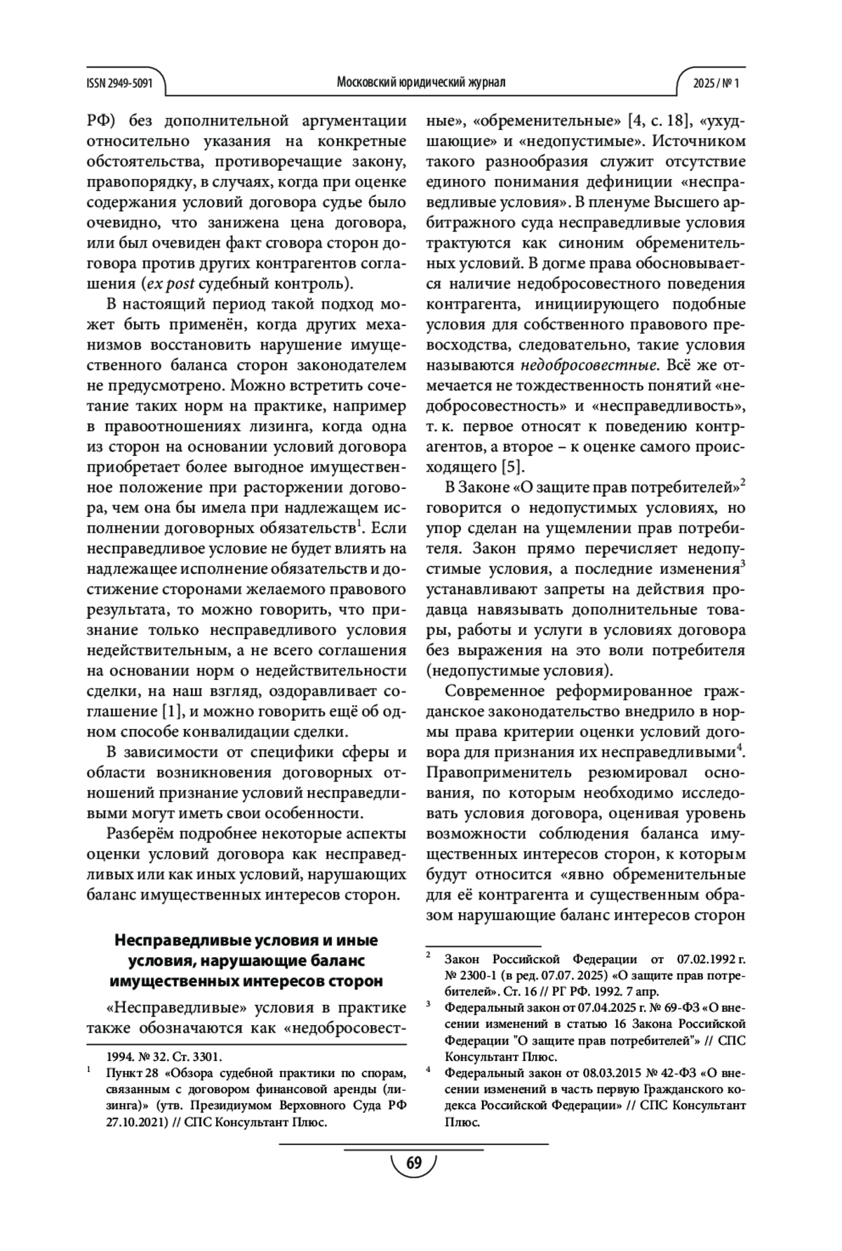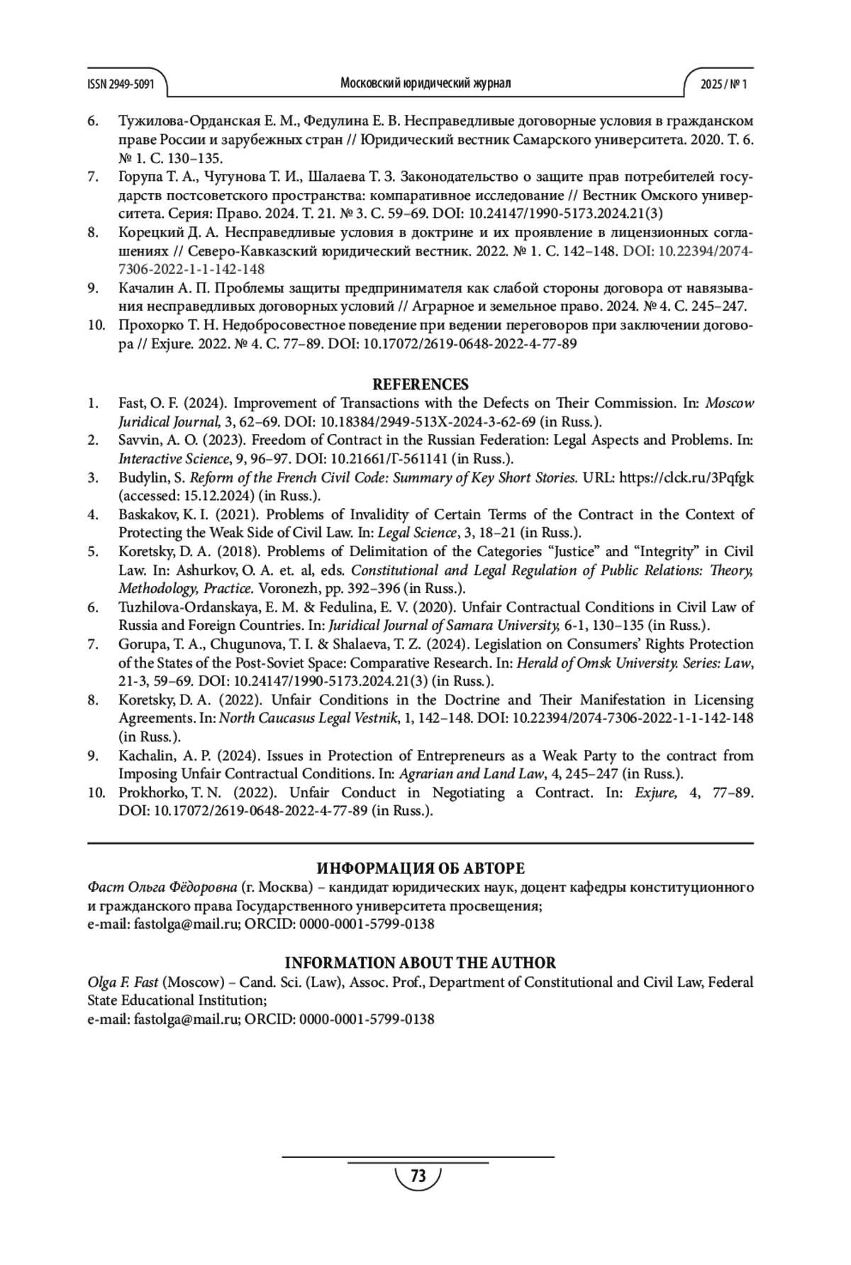 6. Тужилова-Орданская Е. М., Федулина Е. В. Несправедливые договорные условия в гражданском праве России и зарубежных стран // Юридический вестник Самарского университета. 2020. Т. 6. № 1. С. 130-135.