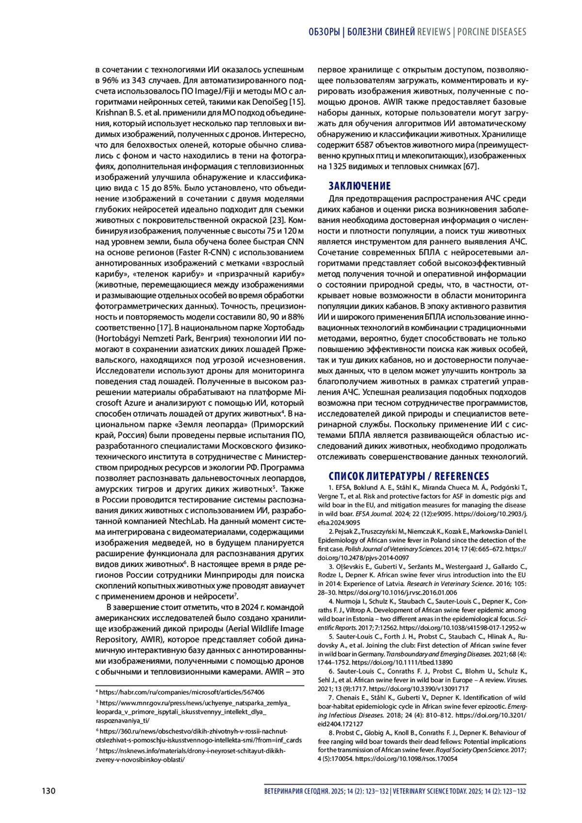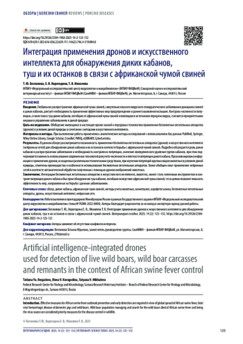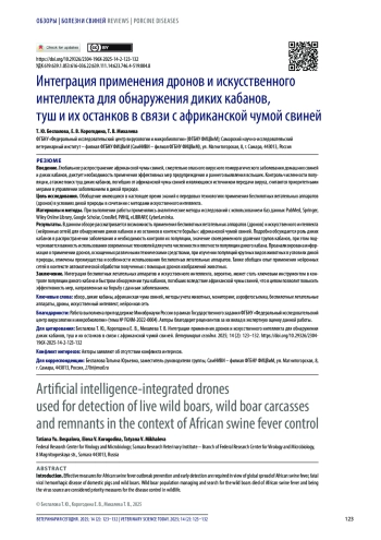 Результаты. В данном обзоре рассматривается возможность применения беспилотных летательных аппаратов (дронов) и искусственного интеллекта (нейронных сетей) для обнаружения диких кабанов и их останков в контексте борьбы с африканской чумой свиней. Подробно обсуждается роль диких кабанов в распространении заболевания и необходимость контроля их популяции, значение своевременного удаления трупов кабанов, при этом подчеркивается важность использования современных технологий для учета численности и плотности популяции дикого кабана. Проанализирована информация о применении дронов, оснащенных различными техническими средствами, при изучении популяций крупных видов животных в условиях дикой природы, отмечены преимущества и особенности использования беспилотных летательных аппаратов. Также обобщен опыт применения нейронных сетей в контексте автоматической обработки полученных с помощью дронов изображений животных.