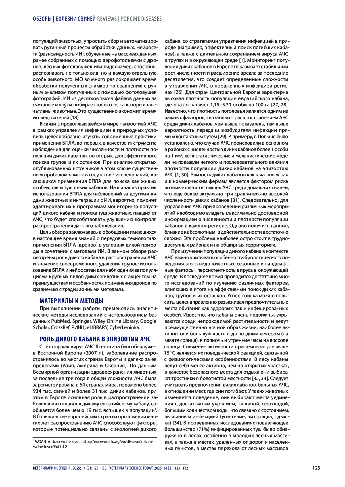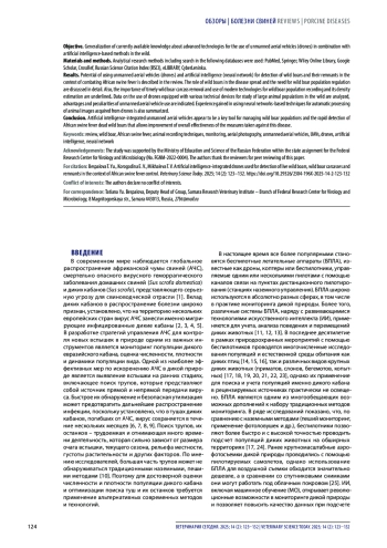 Введение. Глобальное распространение африканской чумы свиней, смертельно опасного вирусного геморрагического заболевания домашних свиней и диких кабанов, диктует необходимость применения эффективных мер предупреждения и раннего выявления вспышек. Контроль численности популяции, а также поиск туш диких кабанов, погибших от африканской чумы свиней и являющихся источником передачи вируса, считаются приоритетными мерами в управлении заболеванием в дикой природе.