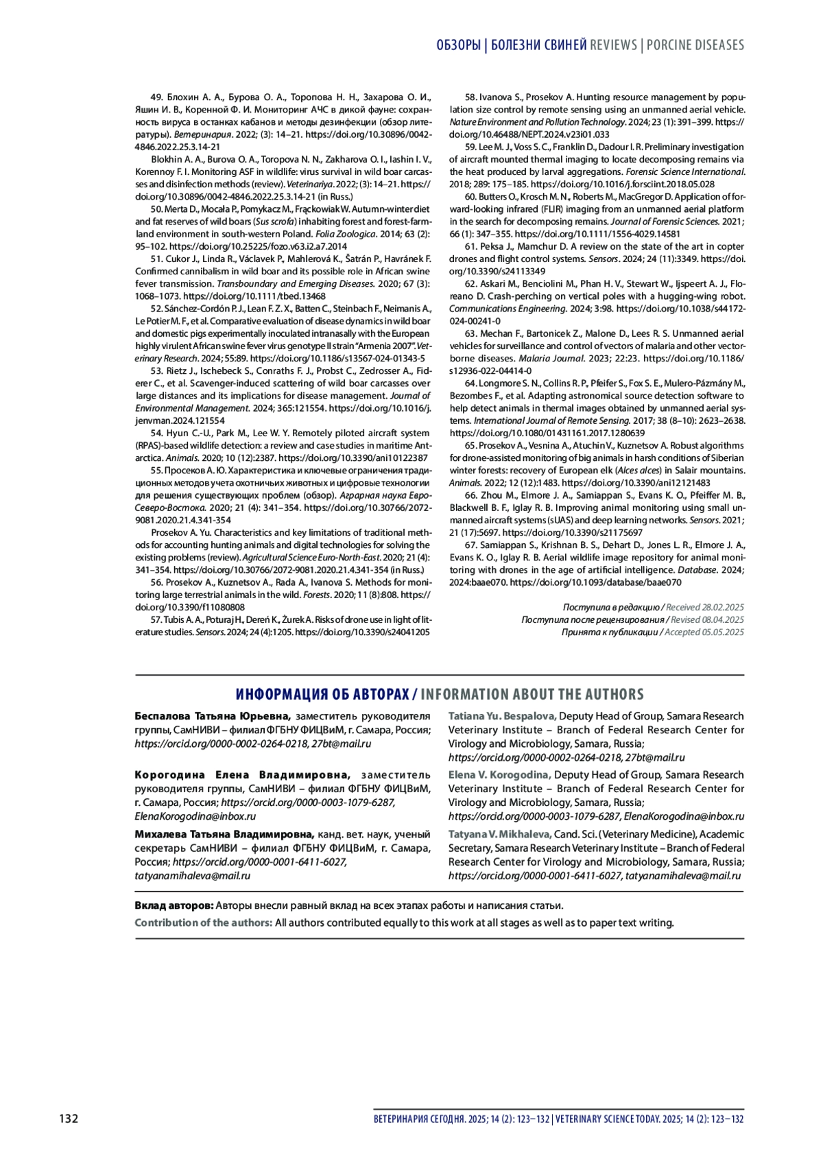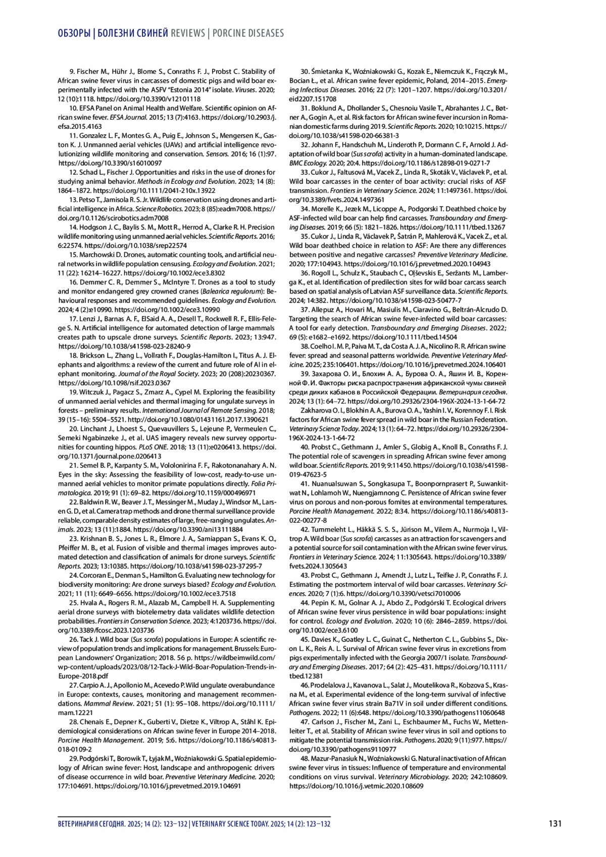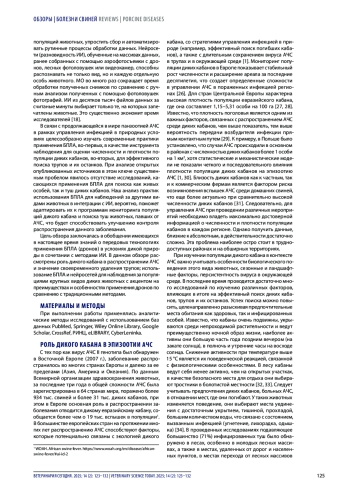 49. Блохин А. А., Бурова О. А., Торопова Н. Н., Захарова О. И., Яшин И. В., Коренной Ф. И. Мониторинг АЧС в дикой фауне: сохранность вируса в останках кабанов и методы дезинфекции (обзор литературы). Ветеринария. 2022; (3): 14-21. DOI: 10.30896/0042-4846.2022.25.3.14-21