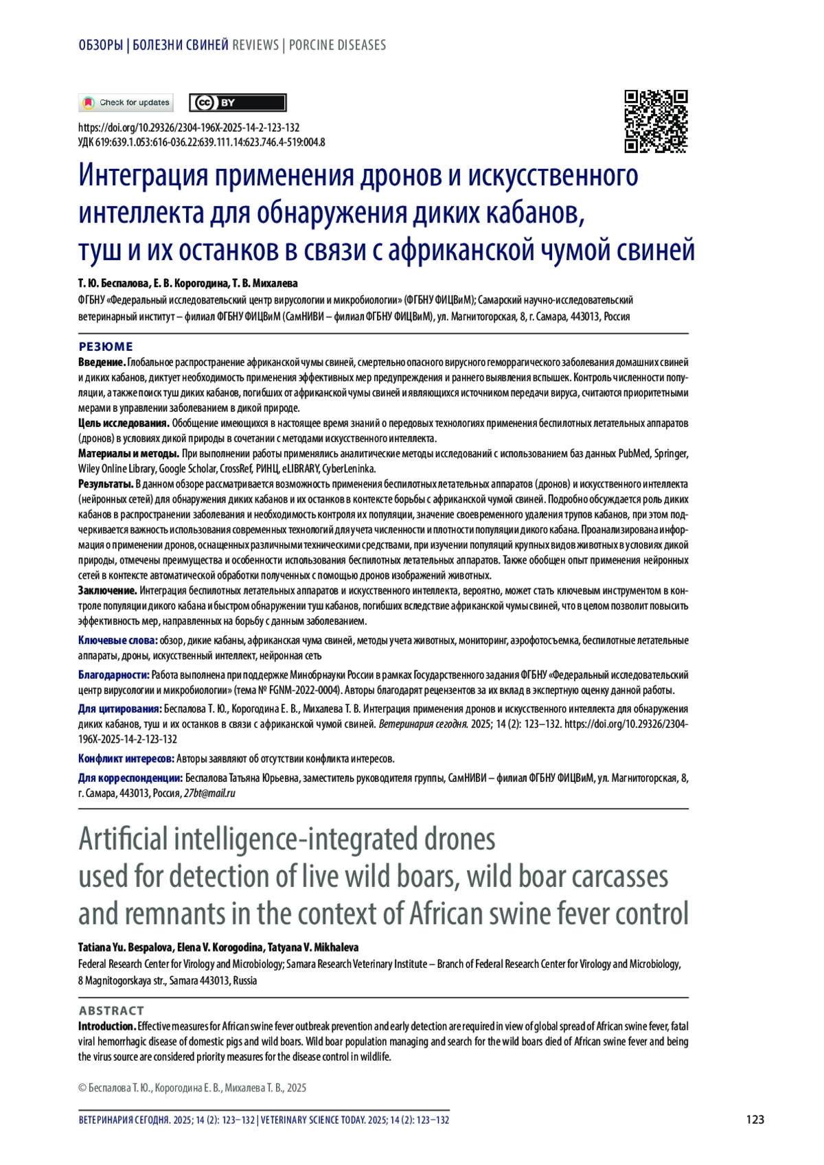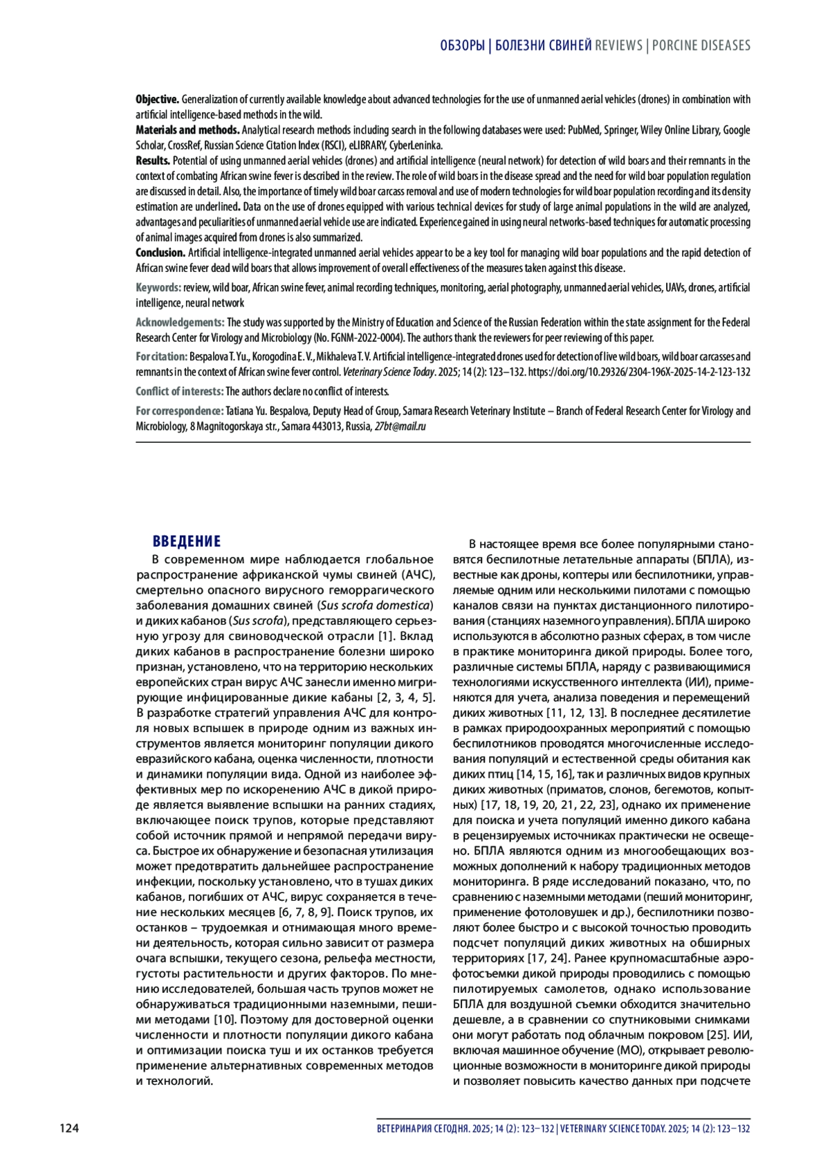 Заключение. Интеграция беспилотных летательных аппаратов и искусственного интеллекта, вероятно, может стать ключевым инструментом в контроле популяции дикого кабана и быстром обнаружении туш кабанов, погибших вследствие африканской чумы свиней, что в целом позволит повысить эффективность мер, направленных на борьбу с данным заболеванием.