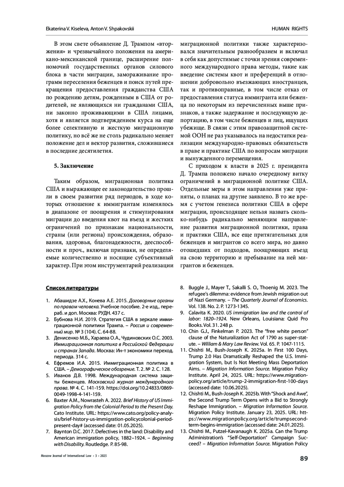 ОБСУЖДЕНИЕ И ВЫВОДЫ. Инструментарий реализации миграционной политики США характеризовался значительным разнообразием и включал в себя как допустимые с точки зрения современного международного права методы, так и не вполне ему корреспондирующие, включая задержание и последующую депортацию мигрантов, беженцев и лиц, ищущих убежище, о чем свидетельствует мониторинг уставными (через процедуру Универсального периодического обзора) и договорными (прежде всего, через рассмотрение периодических докладов) органами реализации международно-правовых обязательств США. При этом крайне жесткие меры, анонсированные и уже предпринятые Д. Трампом в 2025 г., не являются радикально меняющими вектор развития миграционной политики, права и практики США, давно отошедших от либеральности и мягкости в установлении условий въезда на свою территорию и пребывания на ней мигрантов и беженцев.