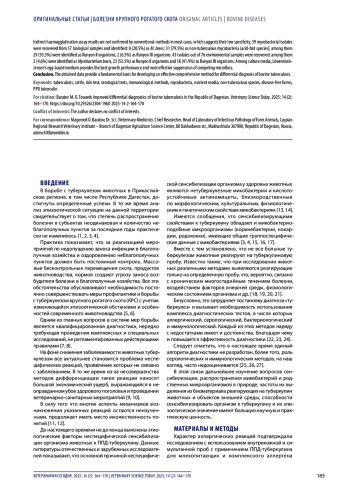 19. Протодьяконова Г. П. Эпизоотологические и эпидемиологические особенности туберкулеза в Якутии, усовершенствование методов диагностики и специфической профилактики: автореф. дис. д-ра вет. наук. Новосибирск; 2015. 35 с. 20. Carneiro P. A. M., de Moura Sousa E., Viana R. B., Monteiro B. M., Do Socorro Lima Kzam A., de Souza D. C., et al. Study on supplemental test to improve the detection of bovine tuberculosis in individual animals and herds. BMC Veterinary Research. 2021; 17:137. DOI: 10.1186/s12917-021-02839-4