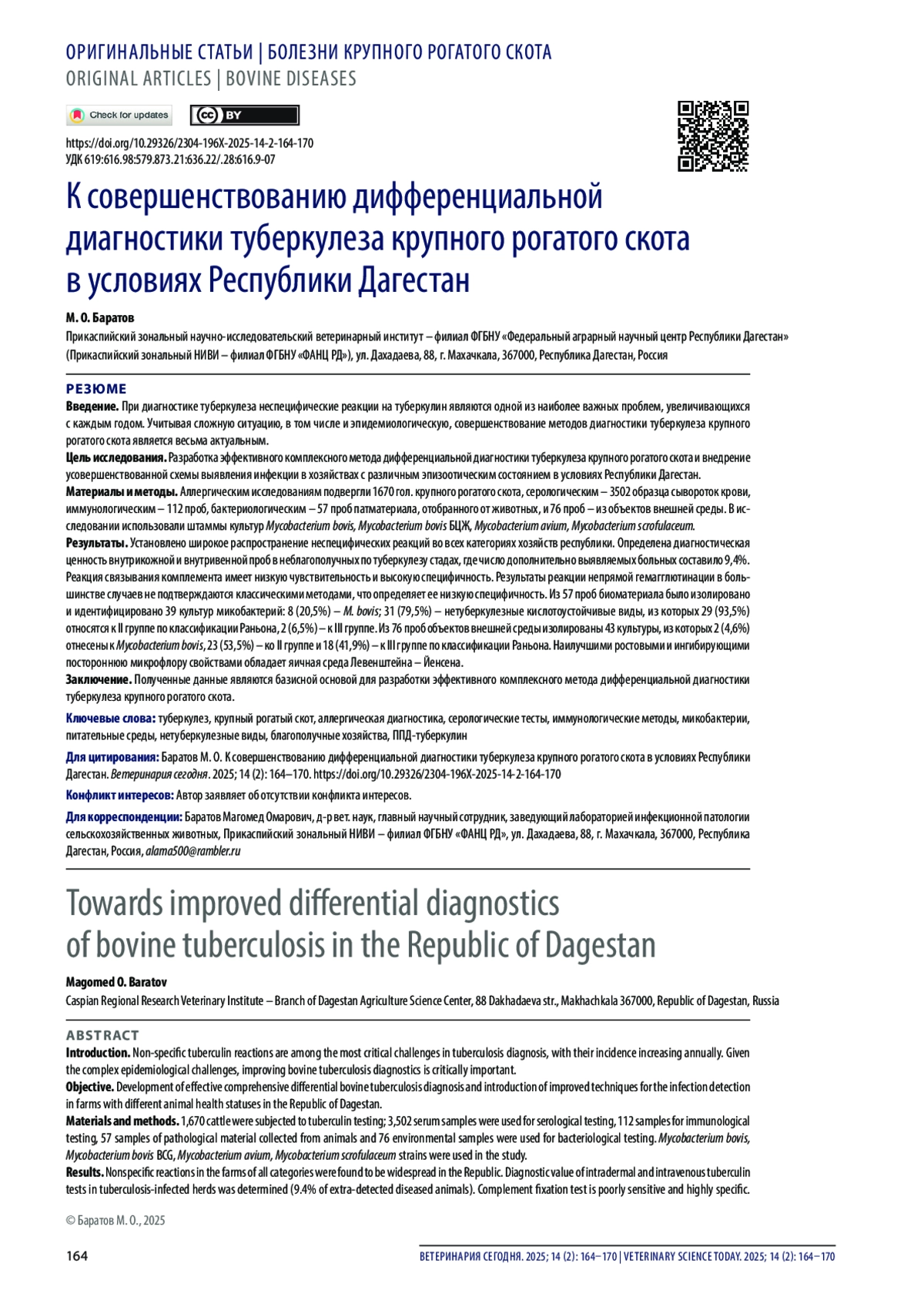 2. Баратов М. О. К совершенствованию диагностики туберкулеза крупного рогатого скота. Ветеринария сегодня. 2020; (4): 261-265. DOI: 10.29326/2304-196X-2020-4-35-261-265