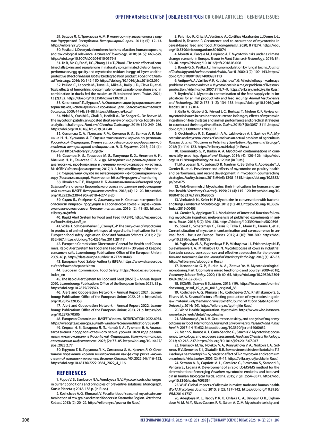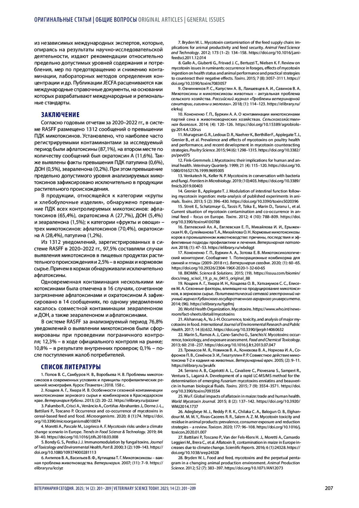 49. Седова И. Б., Захарова Л. П., Чалый З. А., Тутельян В. А. Анализ загрязнения продовольственного зерна урожая 2020 года различными микотоксинами в Российской Федерации. Иммунопатология, аллергология, инфектология. 2023; (2): 77-85. DOI: 10.14427/jipai.2023.2.77