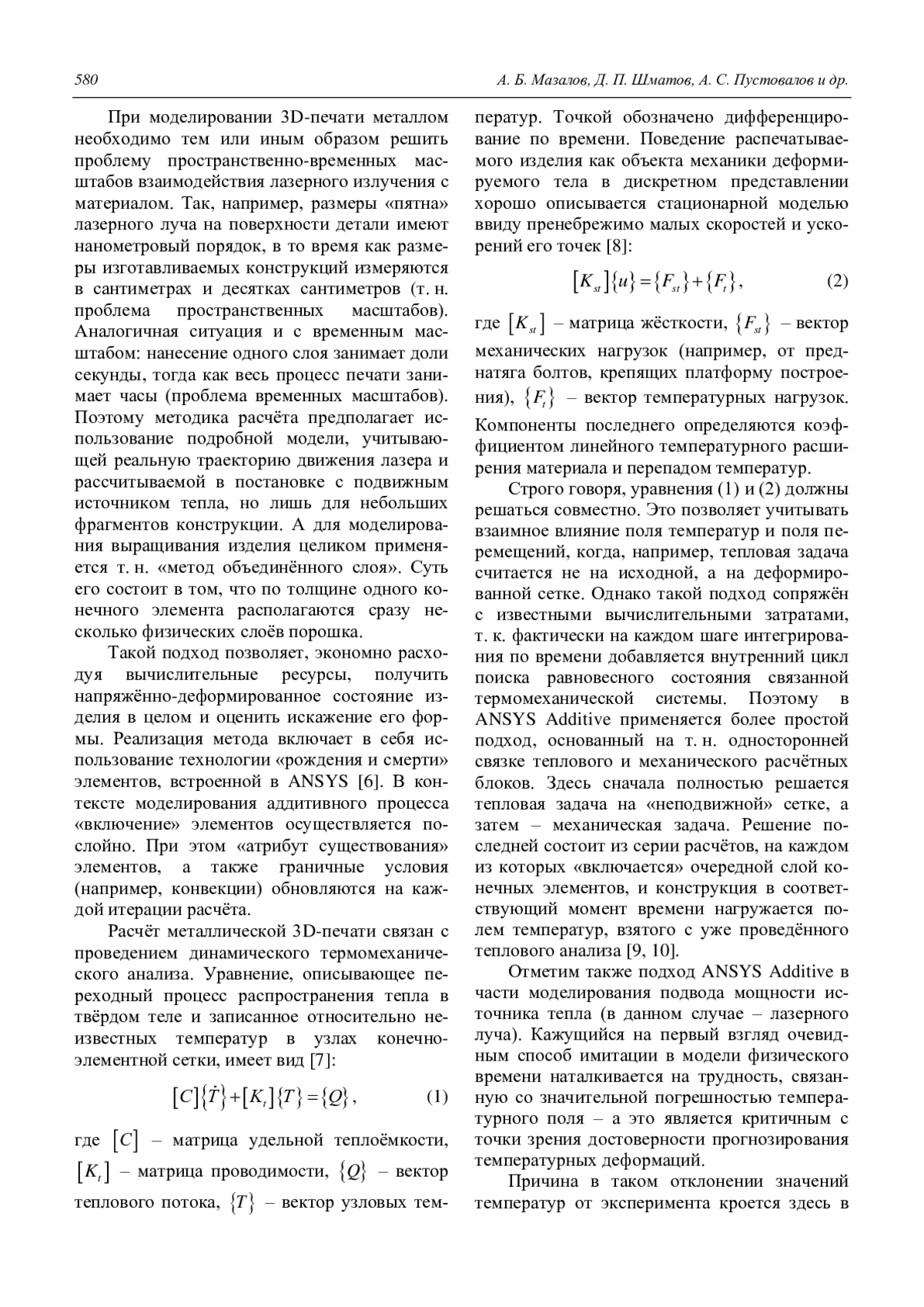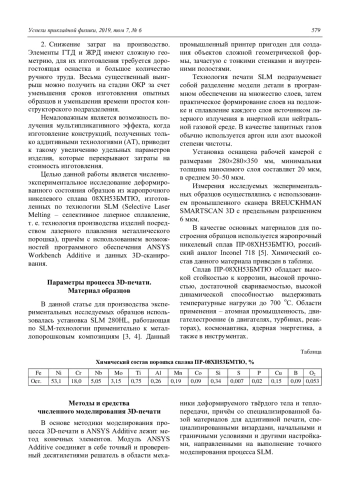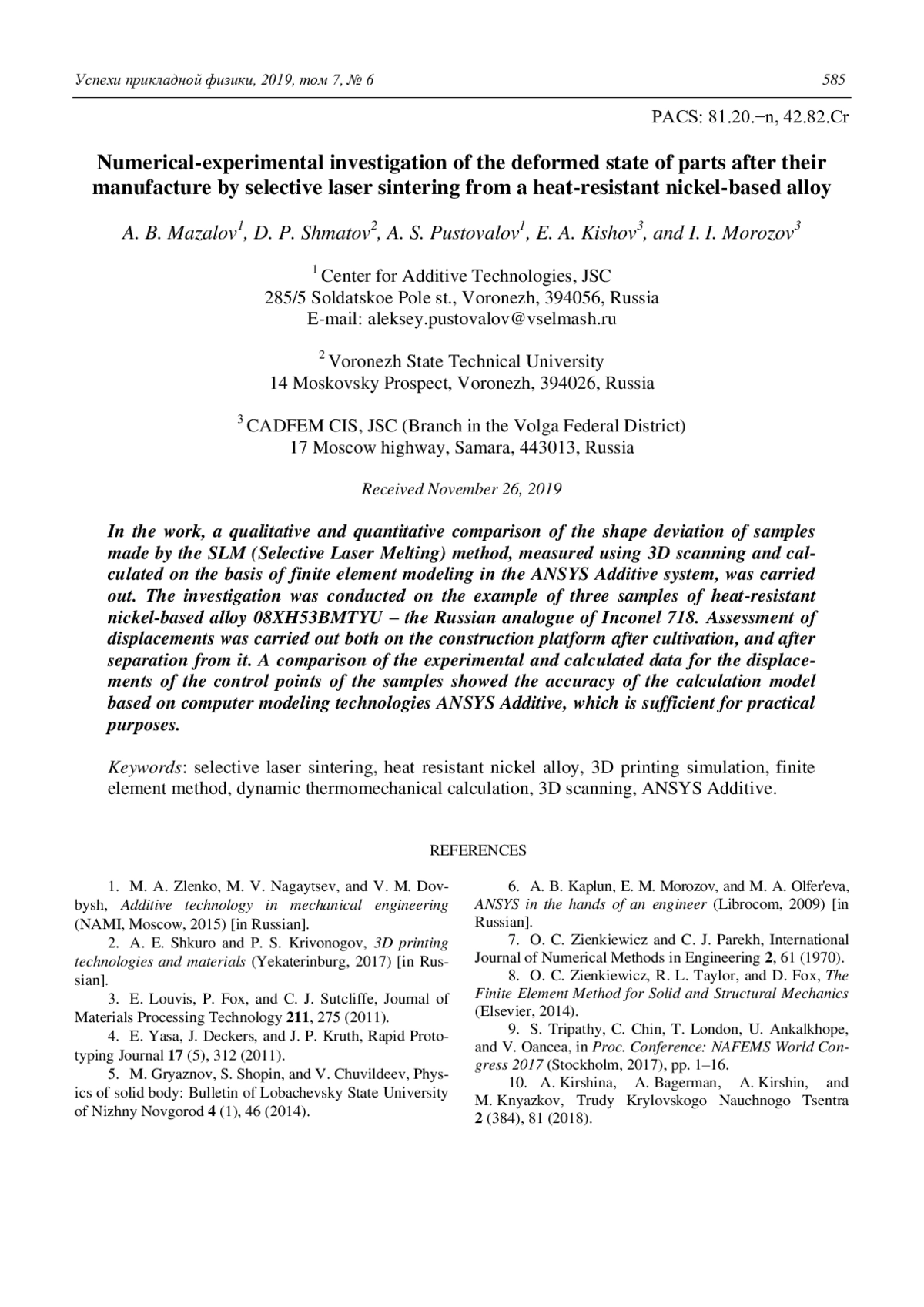 A. B. Mazalov, D. P. Shmatov, A. S. Pustovalov, E. A. Kishov, and I. I. Morozov Numerical-experimental investigation of the deformed state of parts after their manufac-ture by selective laser sintering from a heat-resistant nickel-based alloy 578