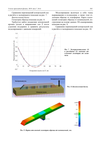 В работе проведено качественное и количественное сравнение отклонения формы образцов, изготовленных методом SLM (Selective Laser Melting – селективное лазерное сплавление), измеренного при помощи 3D-сканирования и рассчитанного на основе конечно-элементного моделирования в системе ANSYS Additive. Исследование проведено на примере трёх образцов из жаропрочного сплава на никелевой основе 08ХН53БМТЮ – российского аналога Inconel 718. Оценка перемещений осуществлялась как на платформе построения после выращивания, так и после отделения от неё. Сопоставление экспериментальных и расчётных данных перемещений контрольных точек образцов показало достаточную для практических целей точность расчетной модели, построенной на базе технологий компьютерного моделирования ANSYS Additive.