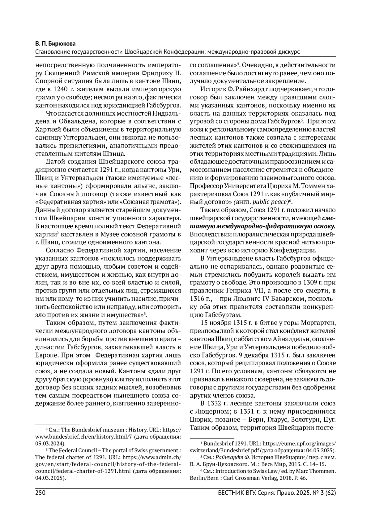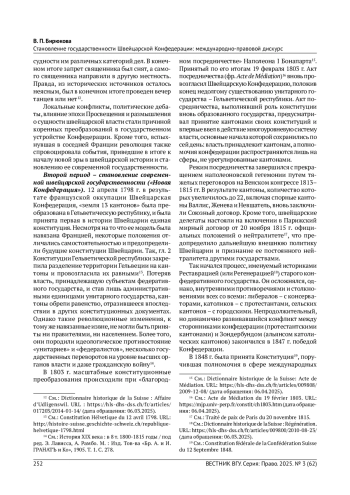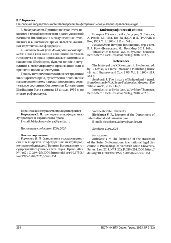 Раскрываются международно-правовые аспекты формирования Швейцарской Конфедерации. Выделяются два этапа развития швейцарской государственности, выявляются ключевые преобразования, вызванные историческими событиями. Исследуются особенности правового регулирования международно-правового статуса Конфедерации. Обосновывается вывод о правовых традициях Швейцарии в международно-правовом аспекте: плюрализме, нейтралитете, демократизме и международном сотрудничестве.