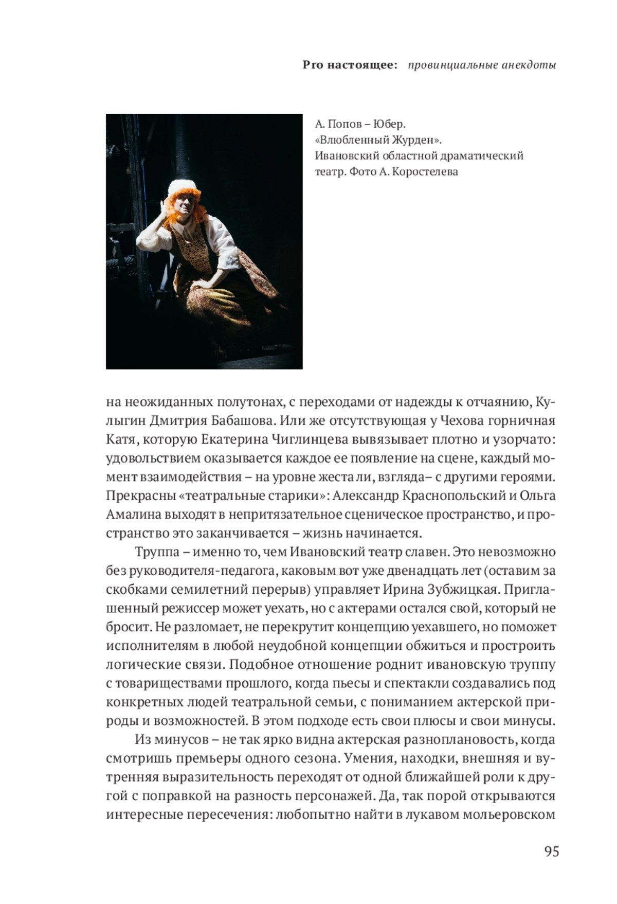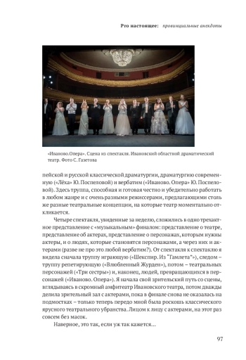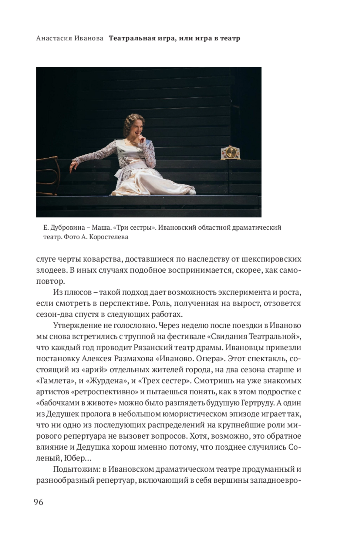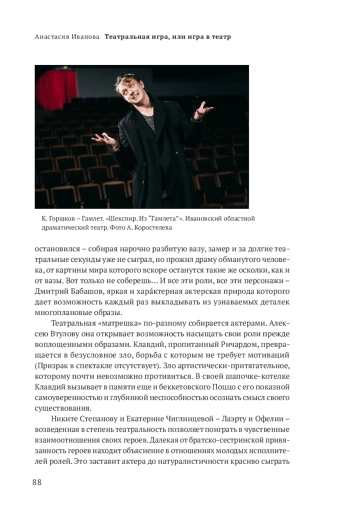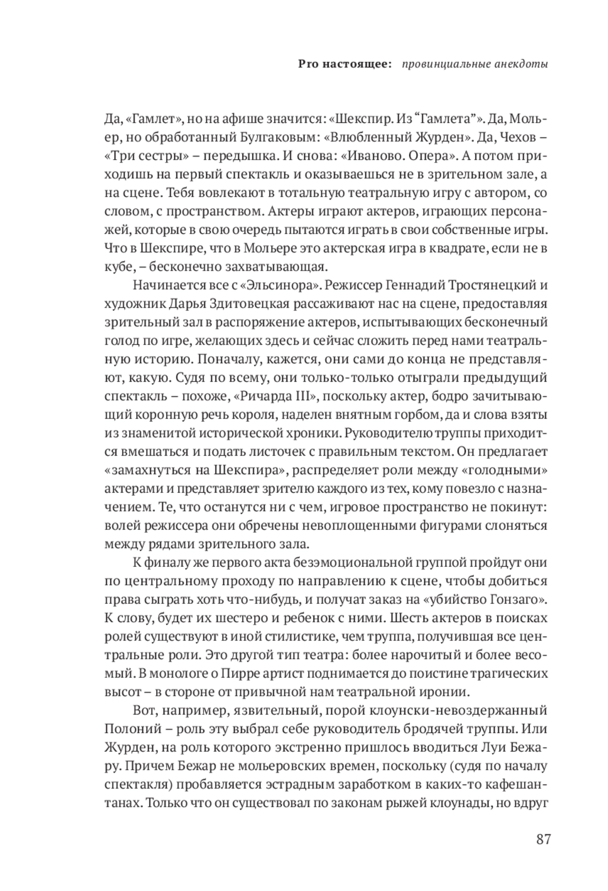 Да, «Гамлет», но на афише значится: «Шекспир. Из “Гамлетаˮ». Да, Мольер, но обработанный Булгаковым: «Влюбленный Журден». Да, Чехов – «Три сестры» – передышка. И снова: «Иваново. Опера». А потом приходишь на первый спектакль и оказываешься не в зрительном зале, а на сцене. Тебя вовлекают в тотальную театральную игру с автором, со словом, с пространством. Актеры играют актеров, играющих персонажей, которые в свою очередь пытаются играть в свои собственные игры. Что в Шекспире, что в Мольере это актерская игра в квадрате, если не в кубе, – бесконечно захватывающая.